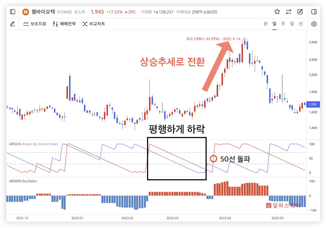 Aroon Up과 Down이 평행하게 하락하는 횡보장이 지난 후, 두 값 중 하나가 50선을 돌파하며 상승하면 횡보장의 탈출로 생각하고 매매할 수 있다.