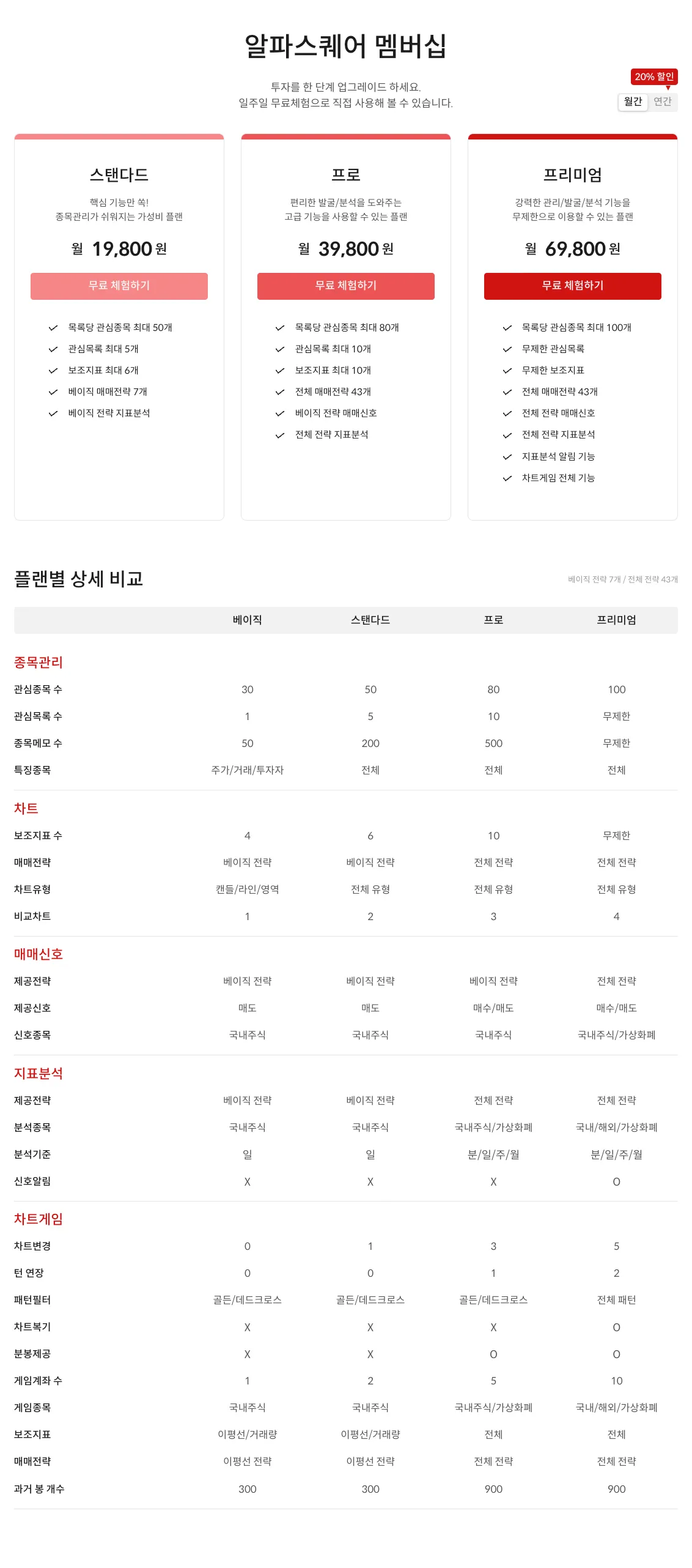 이번 새롭게 출시되는 통합 멤버십 플랜에는 강화된 기본 기능과 더불어 매매신호, 지표분석, 차트게임 등 기존 기능별 플랜들을 보다 합리적인 가격에 모두 이용할 수 있습니다. 멤버십 플랜 출시 이후에도 멀티차트, 패턴분석 개편, 재무제표(10개년) 등 다양한 기능들이 추가될 예정이니 많은 기대 부탁드립니다.