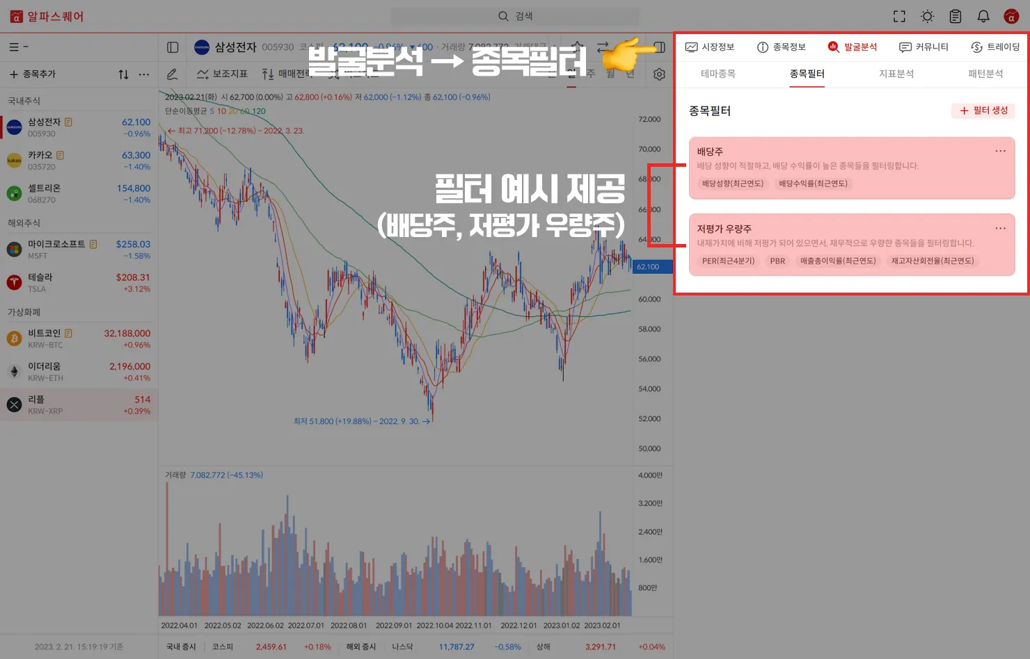 계정 생성 시 ‘배당주’와 ‘저평가 우량주’ 두 개의 기본 필터가 제공됩니다.