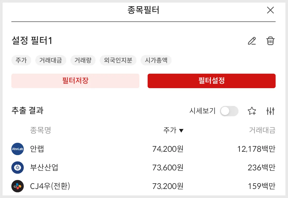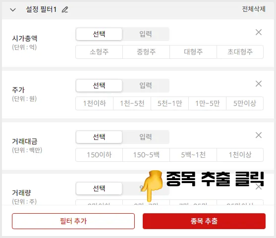 개선 전: 필터 클릭 후 종목 추출 버튼 클릭시 결과를 볼 수 있습니다.