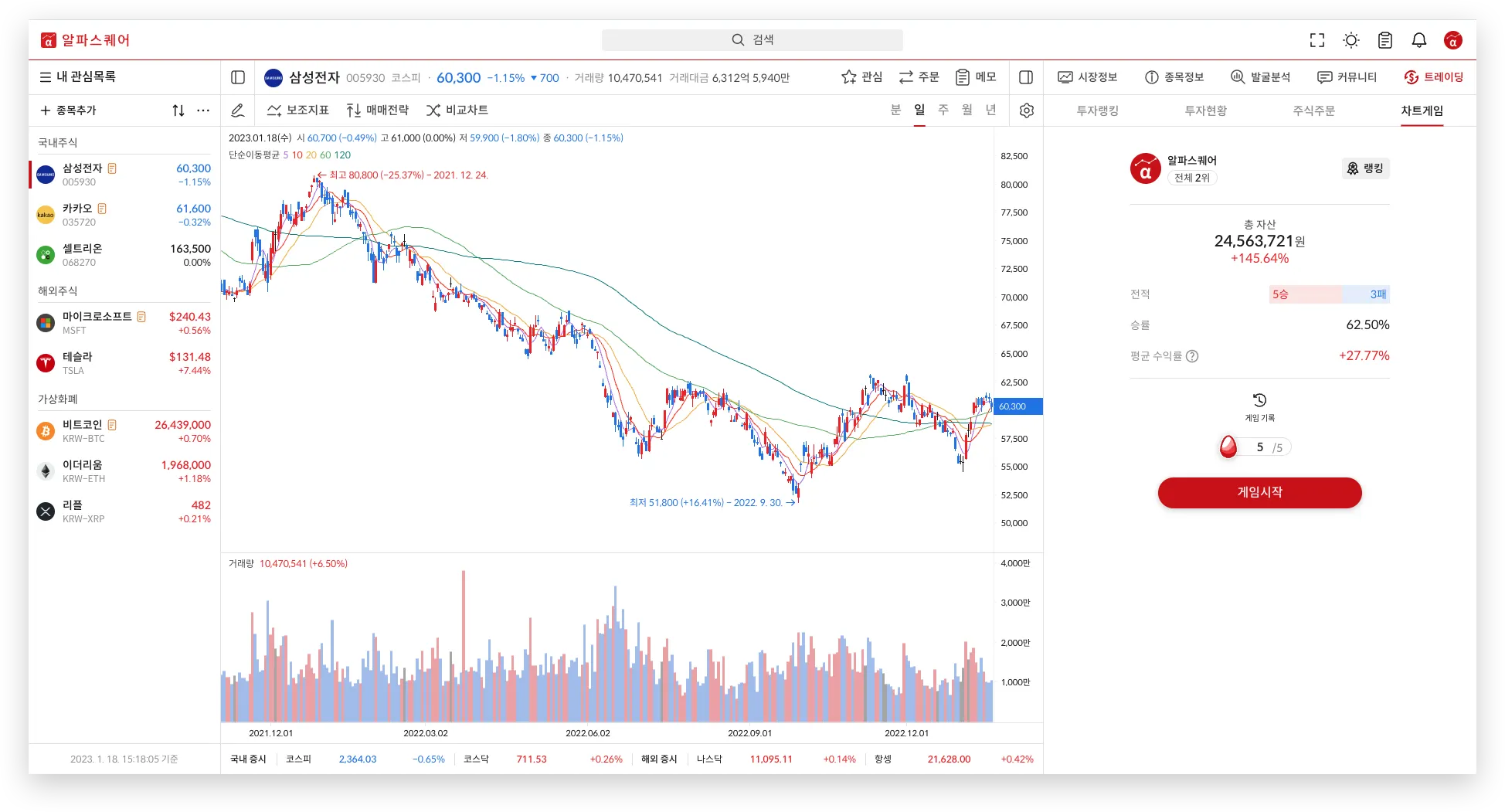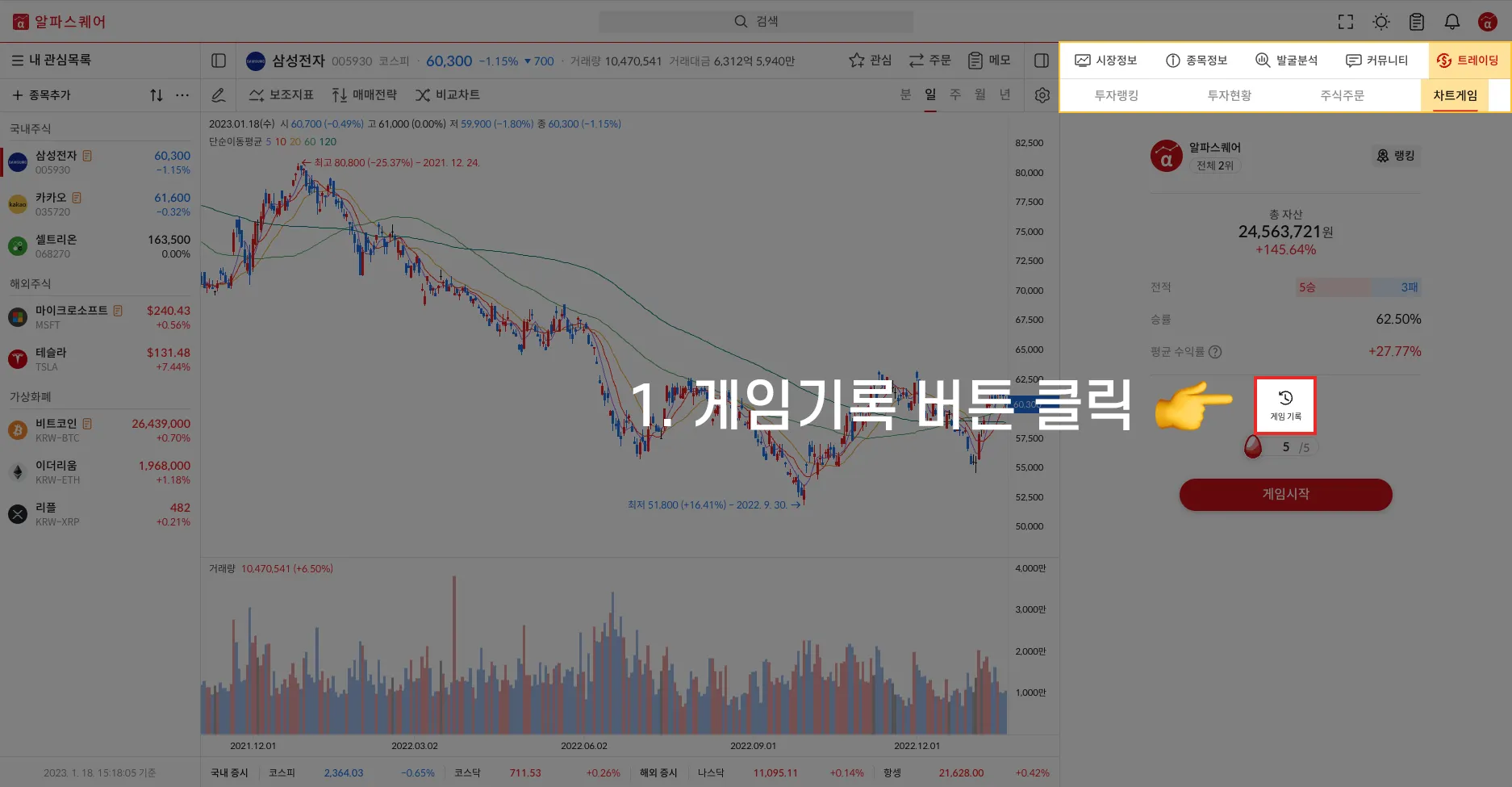 트레이딩 메뉴의 4번째 기능으로 ‘차트게임’이 새로 생겼습니다