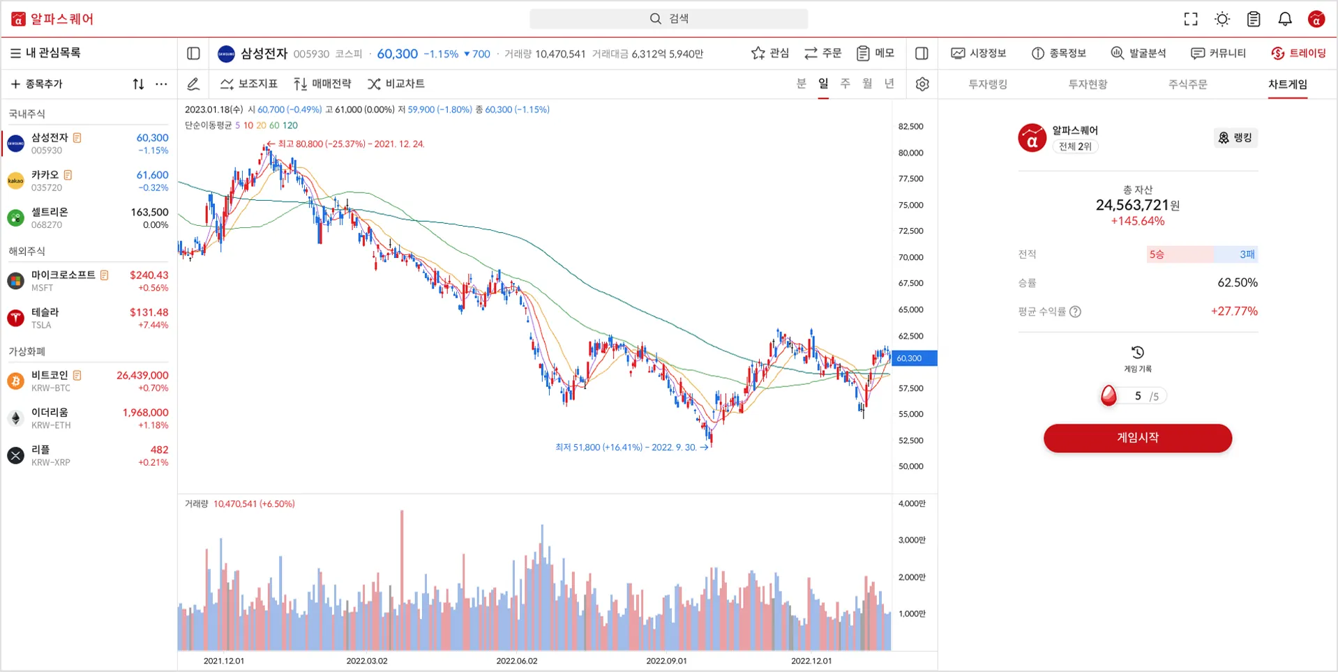 차트게임은 실제 과거 차트를 활용하여 매매연습을 할 수 있는 기능으로, 차트 매매 스킬을 시간에 구애받지 않고 연습하고 싶은 분들께 유용합니다.