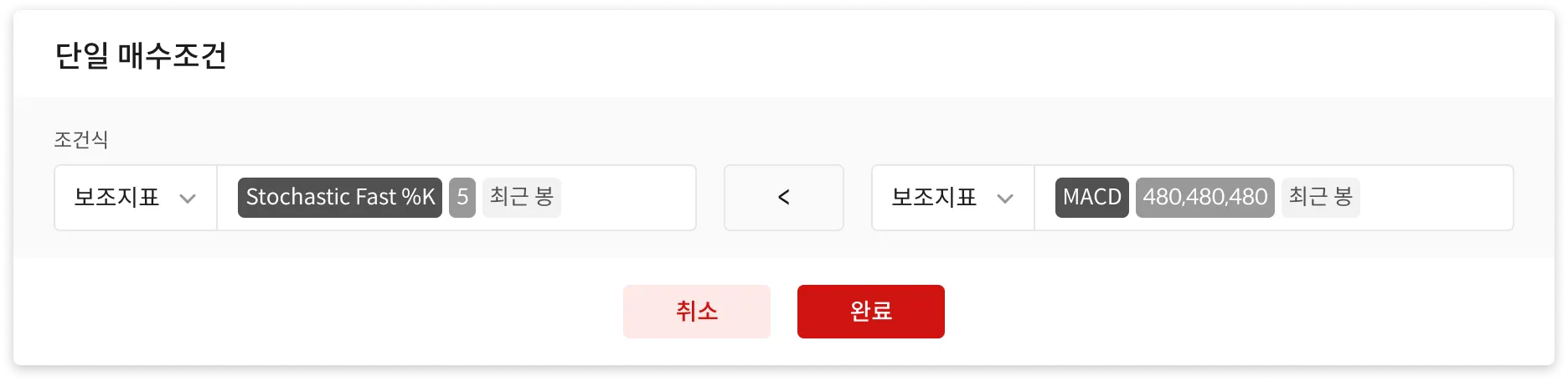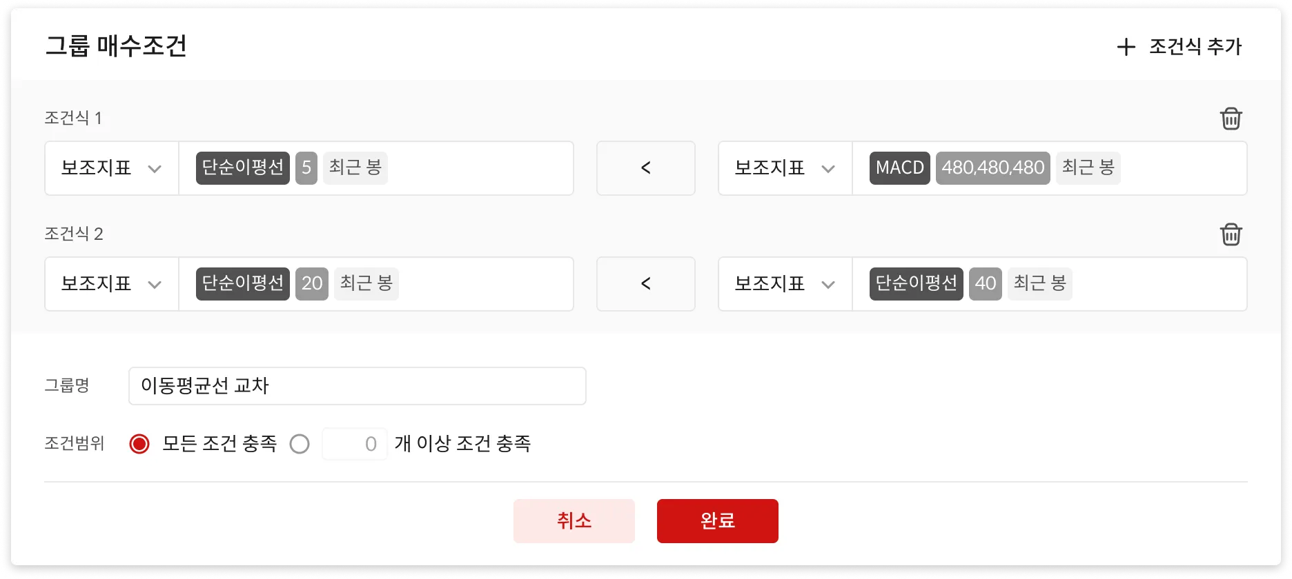 조건식을 지정하여 매매 알고리즘을 만들 수 있습니다.