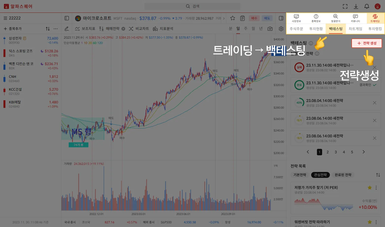 전략생성 버튼을 눌러 백테스팅 기능을 경험해보세요.