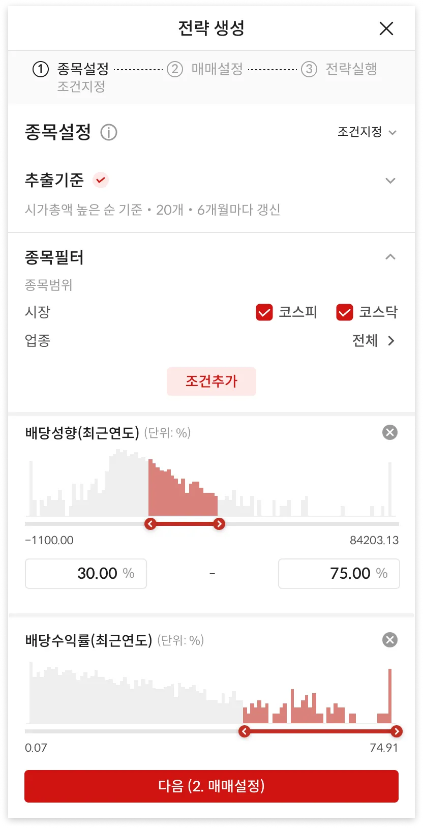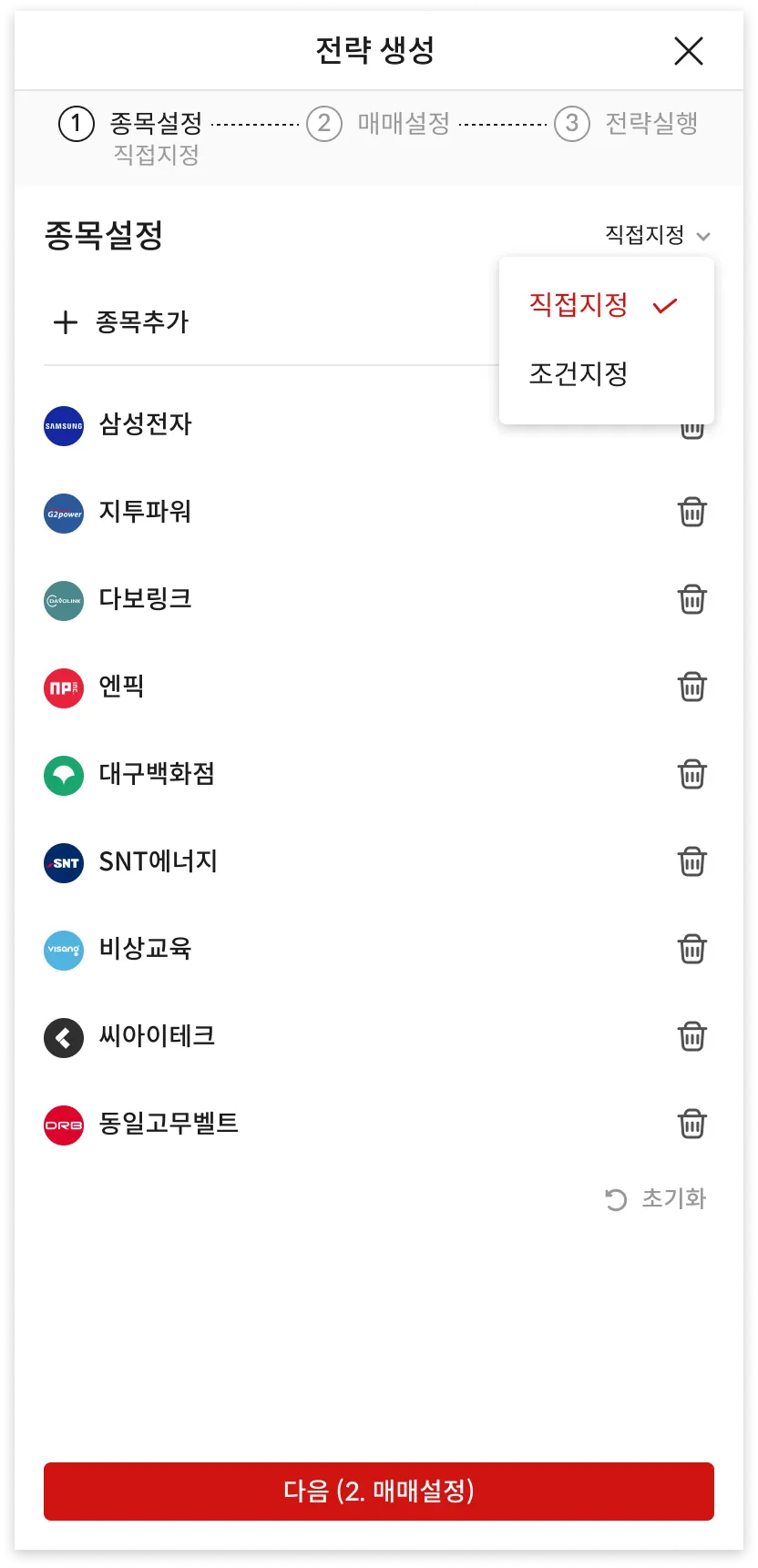투자할 종목을 설정하는 단계입니다. 두 가지 방법으로 원하는 종목을 지정할 수 있습니다.