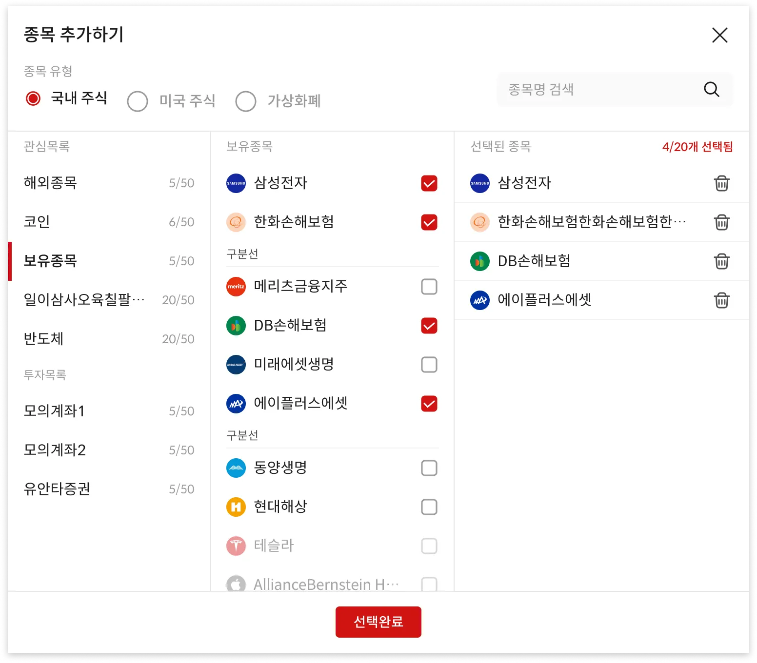 종목을 최대 20개까지 직접 선정할 수 있습니다.