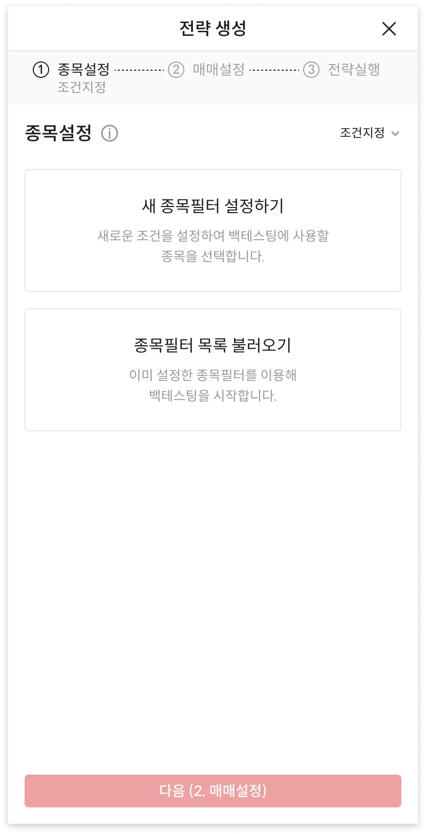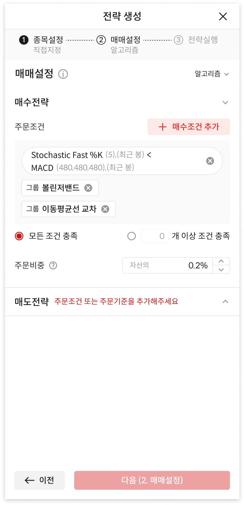 원하는 조건에 따라 매수/매도 시점을 설정할 수 있습니다. 매매설정 역시 두 가지 설정 옵션을 지원합니다.