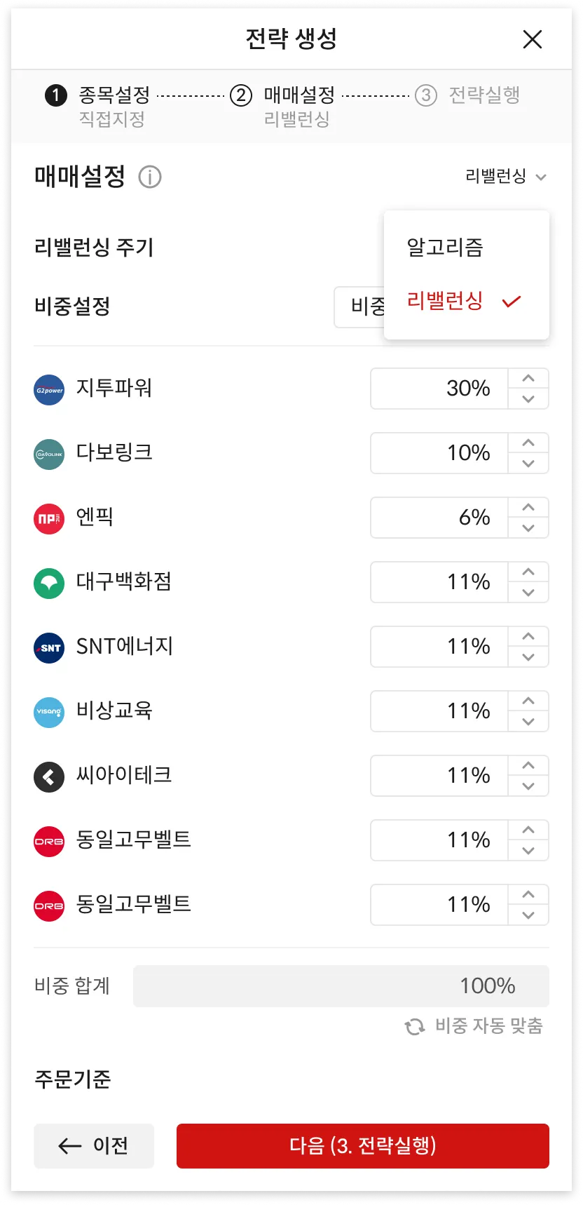 지정한 주기마다, 포트폴리오 내의 종목이 설정해둔 비중에 맞게 매수/매도합니다.