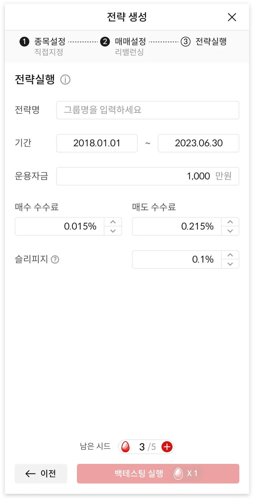 백테스팅 실행 기간과 운용자금을 지정할 수 있습니다.