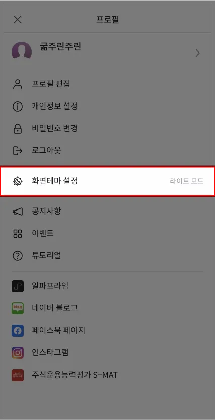 이제 프로필 옵션에 ‘화면테마 설정’이 추가됩니다.