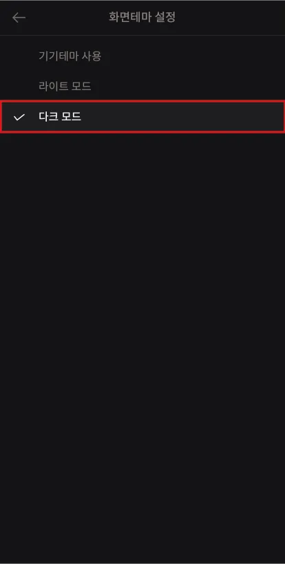 다크 모드: 어두운 바탕의 화면테마가 적용됩니다.