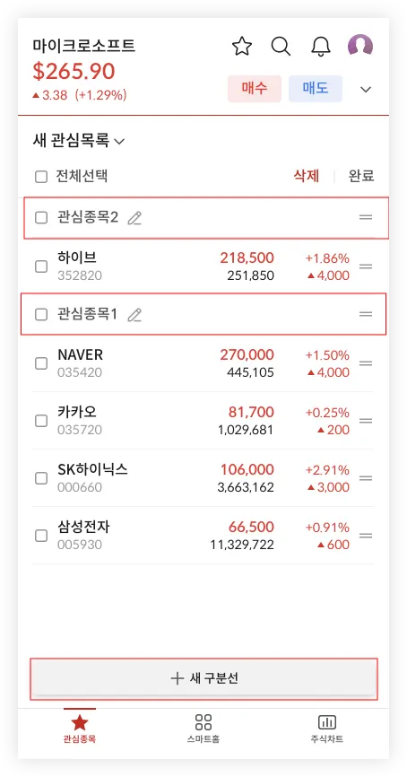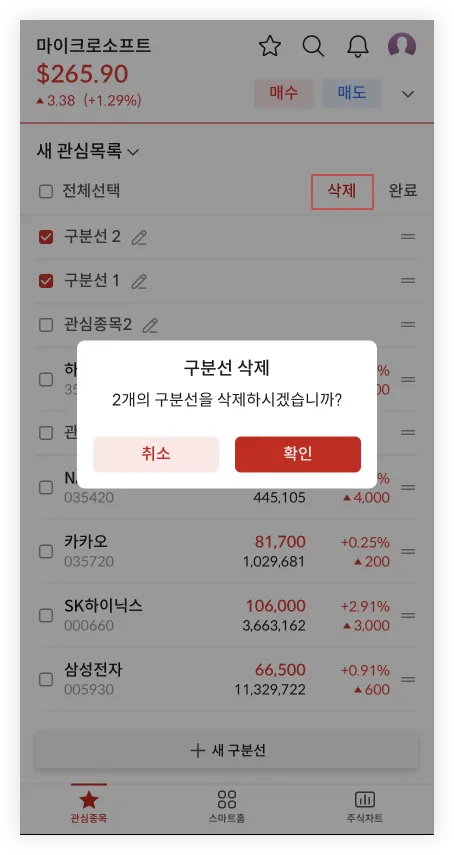 추가한 구분선은 목록에 있는 종목과 마찬가지로, 이동 및 삭제가 가능합니다.