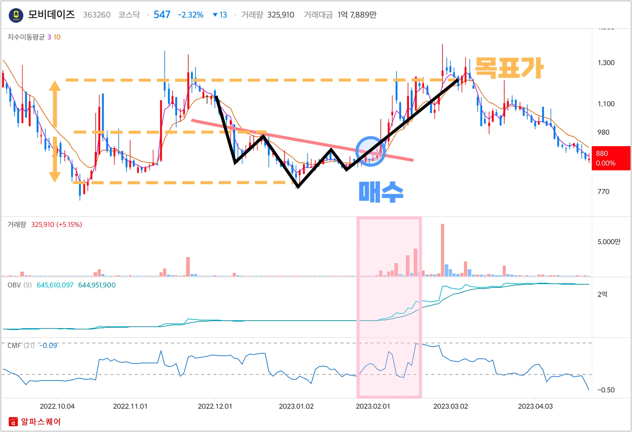 거래량 변화를 확인하기 위해 거래량 기반으로 한 지표 CMF>0 또는 OBV가 상승 혹은 강한 추세를 보이는지 확인할 수 있습니다.