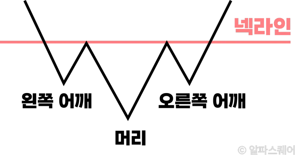 역 헤드앤숄더 패턴은 왼쪽 어깨, 머리, 오른쪽 어깨 각 3개의 저점을 형성한 후 넥라인을 상향 이탈하게 되면서 패턴이 완성되며, 넥라인은 두 개의 고점을 연결한 수평선으로 형성됩니다.