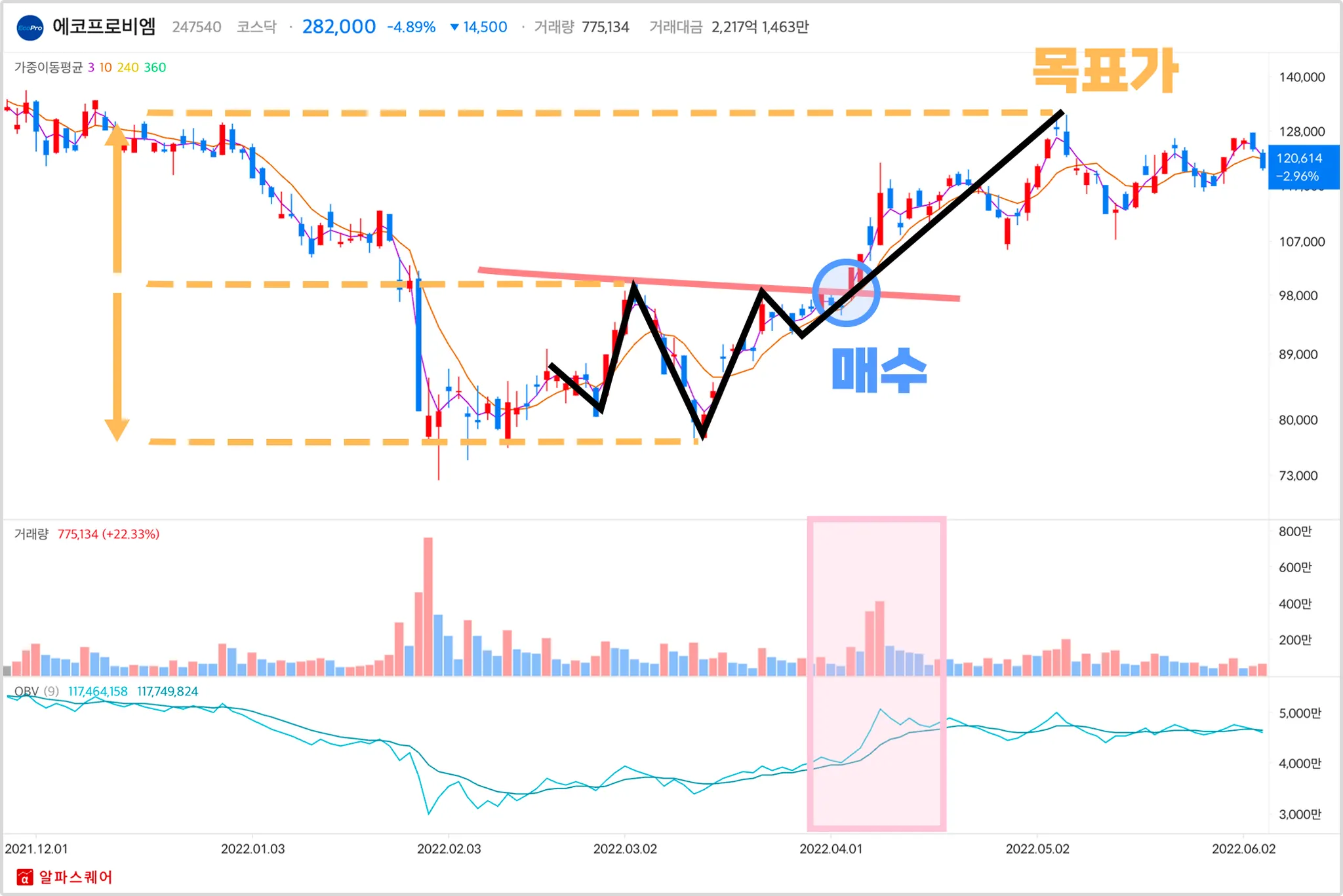 에코프로비엠은 최근 2차전지와 관련해 크게 주목 받았던 종목입니다. 이차전지의 4대 핵심소재 중 하나인 양극소재 사업을 영위하고 있습니다. 에코프로비엠 차트에서 역헤드앤숄더 패턴을 찾아볼 수 있습니다.