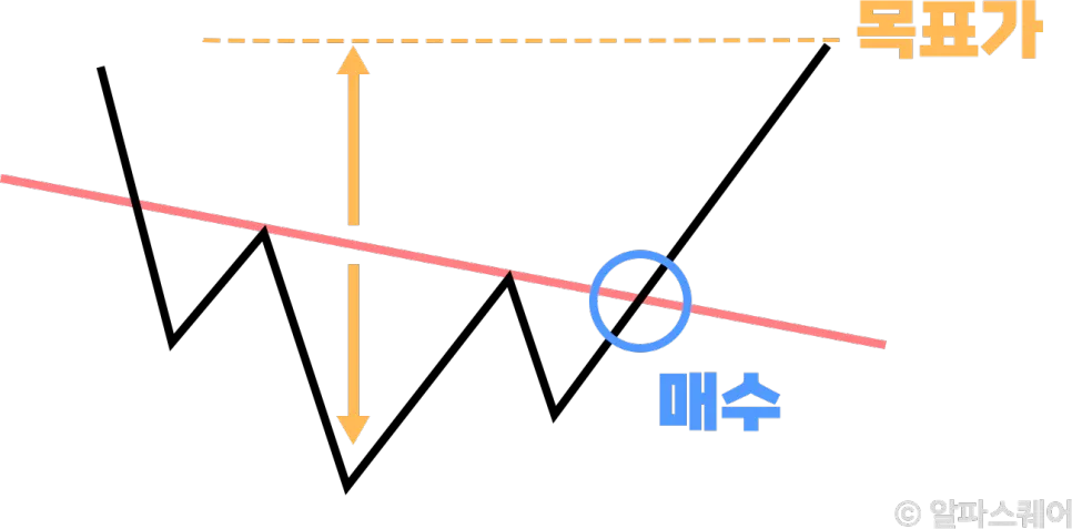 목표가 설정을 위해 넥라인에서 머리까지의 거리 만큼을 상승한 지점을 목표가로 설정할 수 있습니다. 단 거리는 수직으로 측정되어야 합니다.