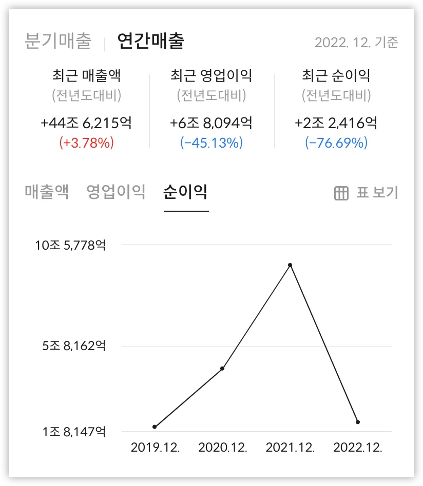 SK하이닉스의 연도별 당기순이익을 살펴보면, 크게 상승하고 내려가는 패턴을 보인다. 2021년에는 약 10조에 가까운 순이익을 올렸지만, 그 다음 해인 2019년에는 1조에 가까운 실적을 발표했다.