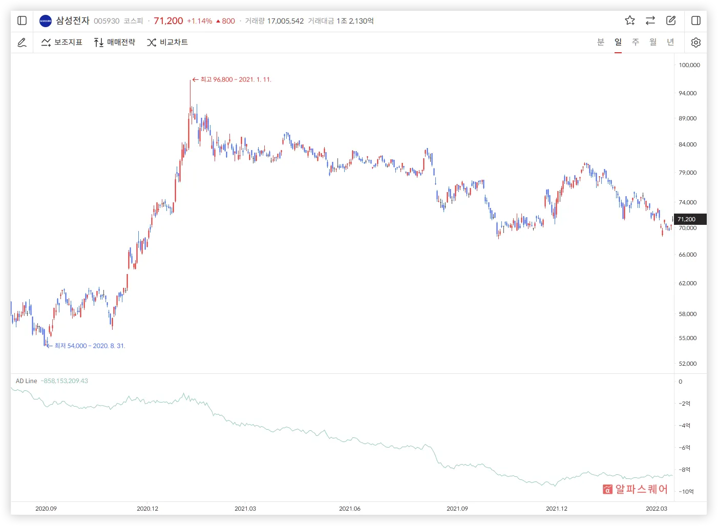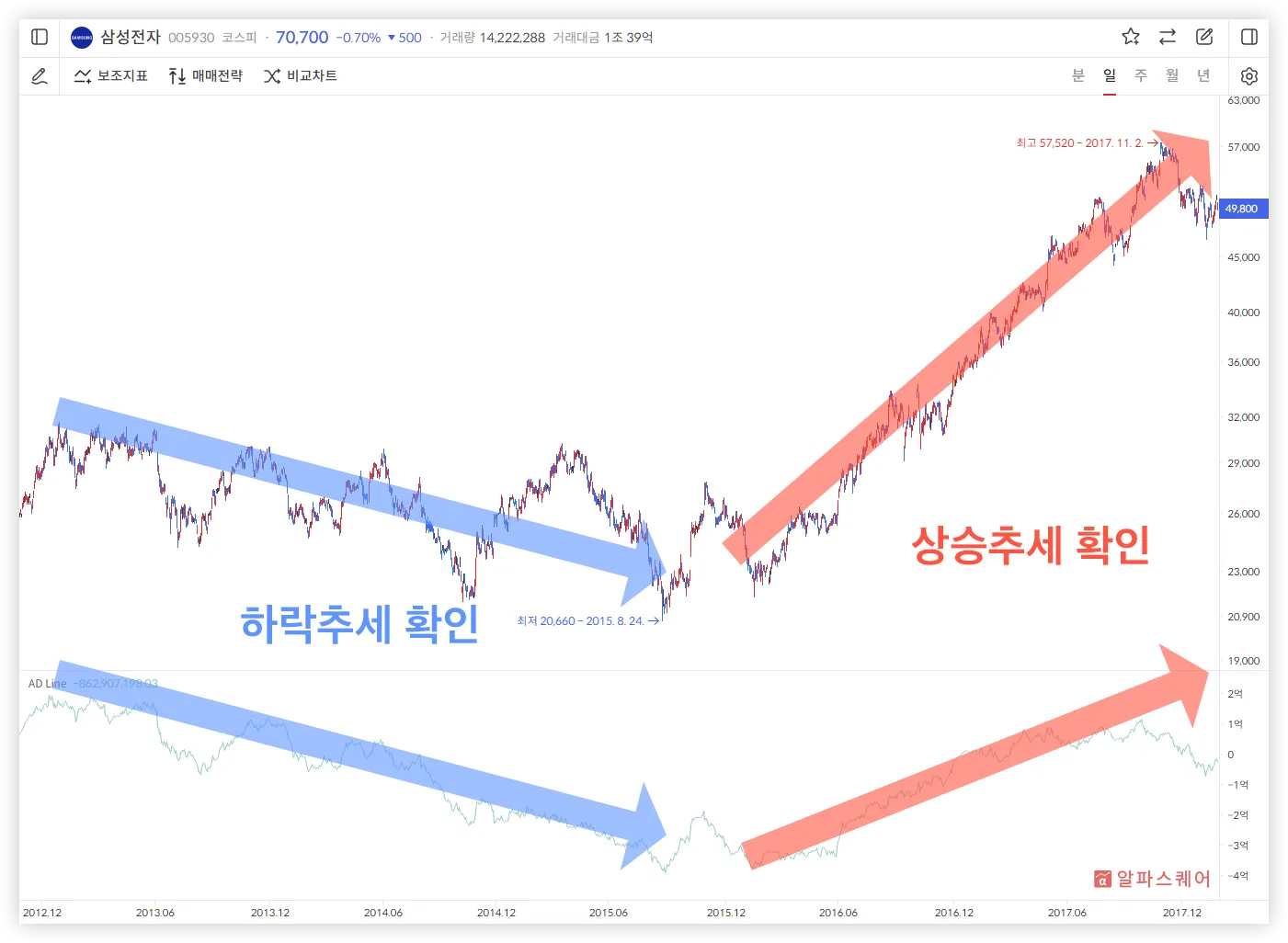 AD Line과 주가가 같은 방향으로 움직인다면, 해당 방향으로의 추세를 지닌다고 해석할 수 있다.