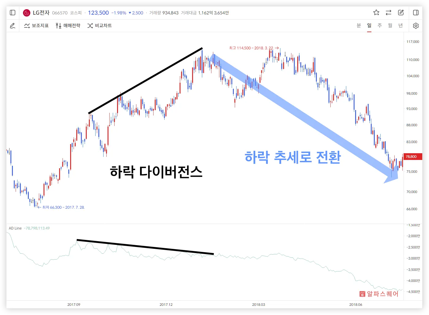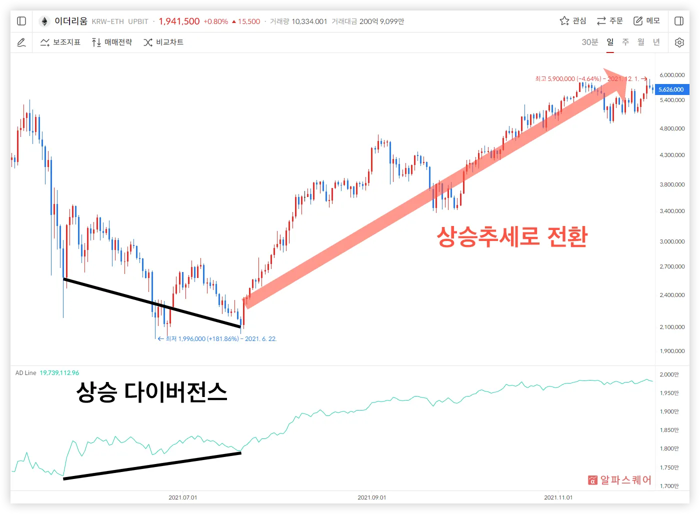다이버전스는 주가와 지표가 반대 방향으로 움직이는 현상을 말한다. 거래량은 가격에 선행하는 성질이 있으므로, 거래량 지표인 AD Line의 다이버전스가 발생할 경우, 주가의 반전을 예상할 수 있다.