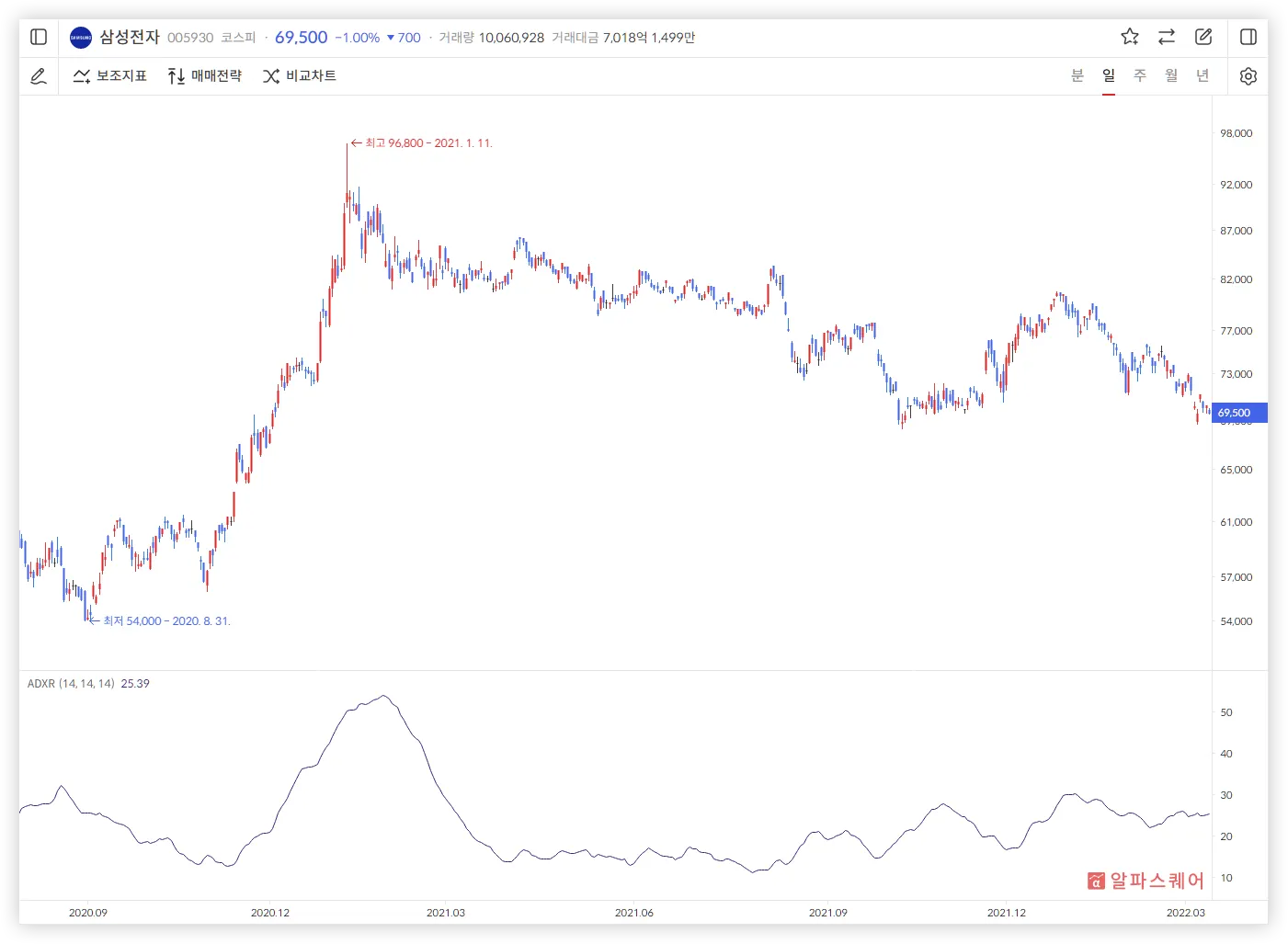 ADXR의 값이 25를 넘어갈 경우 추세적 시장, 20 이하일 경우 비추세적 시장로 구분할 수 있다.