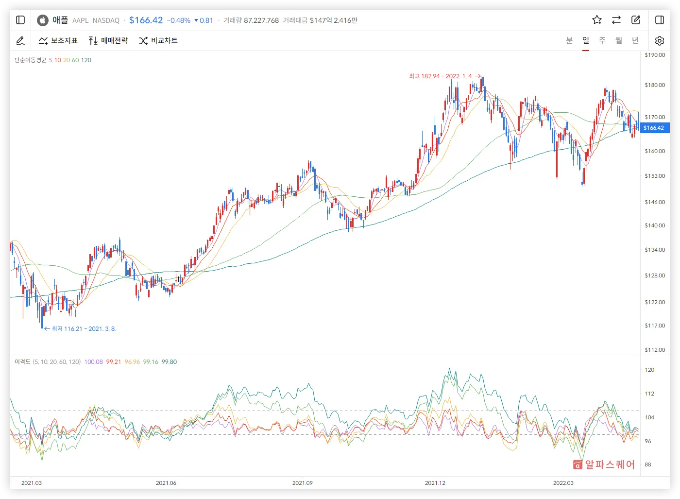 이격도가 100 이상이라면 현재 주가가 이동평균선보다 위에 있음을, 100 이하라면 주가가 이동평균선 아래에 있음을 나타낸다.