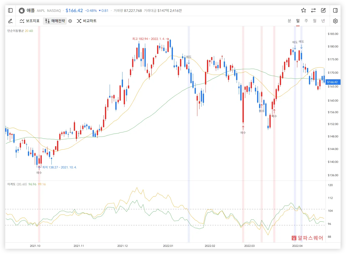 매매전략 기능은 개별 매매전략의 매매시점을 차트에 표기해주며, 지표분석 기능은 전체 매매전략 중 해당 종목에 가장 높은 수익률을 내는 매매전략을 제공합니다.