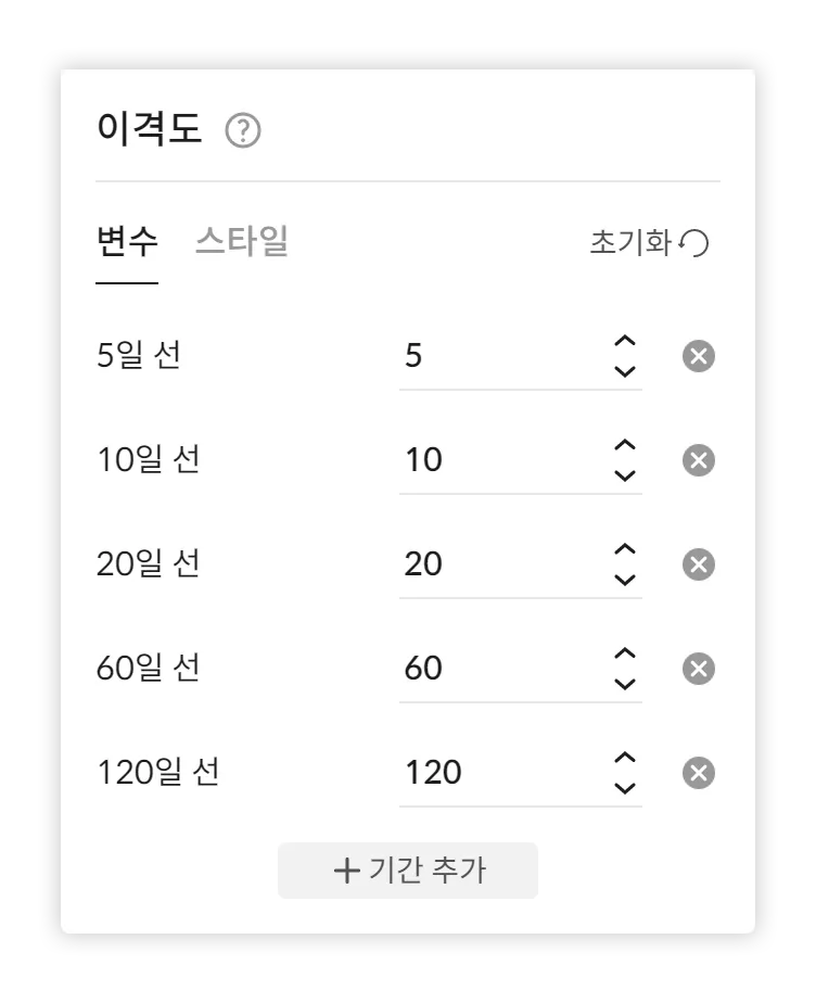 기간: 이격도 계산에 사용되는 이동평균선의 기간을 결정한다. 복수의 기간을 선택할 수 있으며, 기본값으로는 5, 10, 20 ,60, 120이 사용된다.