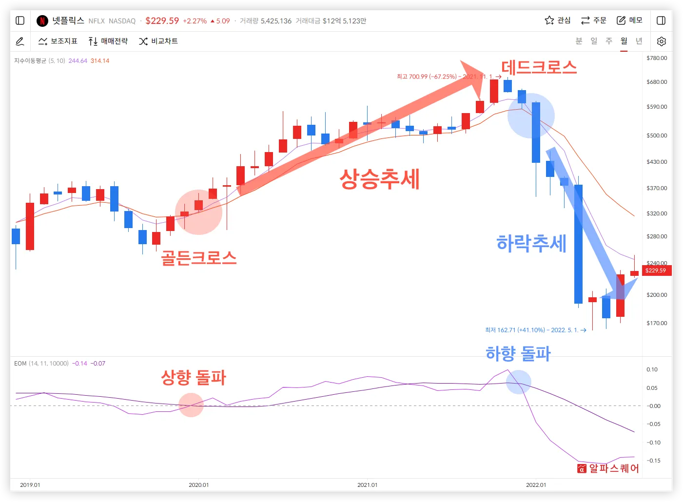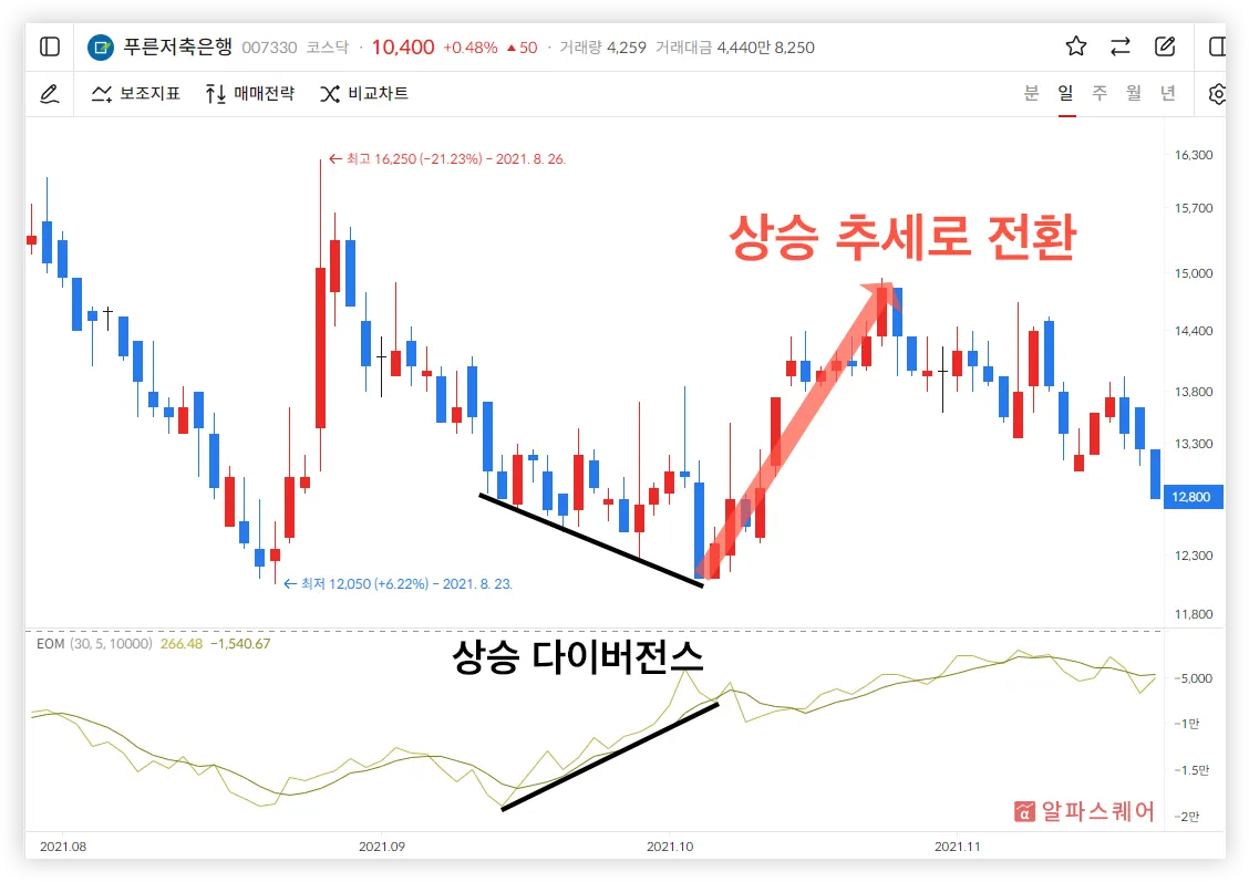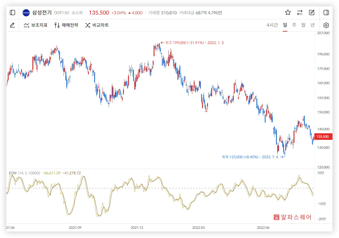 EOM이 0선 위에서 머무르면 상승 추세, 0선 아래에서 머무르면 하락 추세이다.