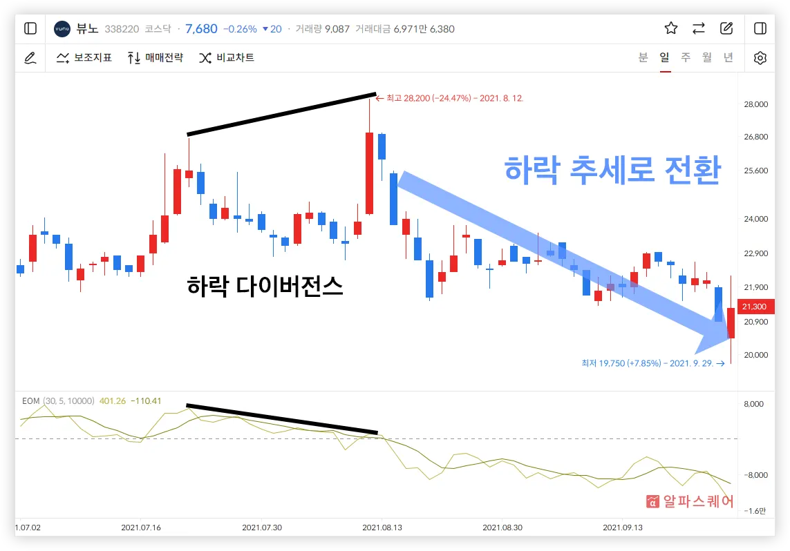 반대로 주가의 고점은 이전 고점보다 높아지는데 EOM의 고점은 이전 저점보다 낮아지면 Bearish 다이버전스가 발생했다고 말한다. 주가가 상승하는 시기에는 EOM이 양수의 값을 갖기 때문에 Bearish 다이버전스는 EOM이 0선 위에 머무를 때 발생한다. 그러므로 점점 하락하던 EOM이 0선을 하향 돌파하면 주가의 추세가 상승에서 하락으로 전환된다. 따라서 Bearish 다이버전스가 발생하면 곧 주가가 하락 추세로 전환될 것을 예측하고 매도하는 전략을 사용할 수 있다.