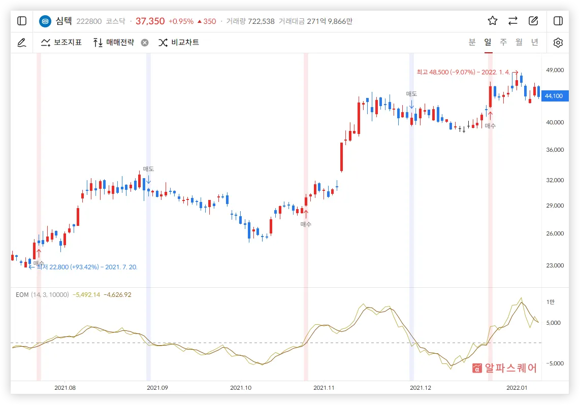 EOM이 0선을 상향 돌파시 매수, 하향 돌파시 매도하는 전략을 사용할 수 있다.