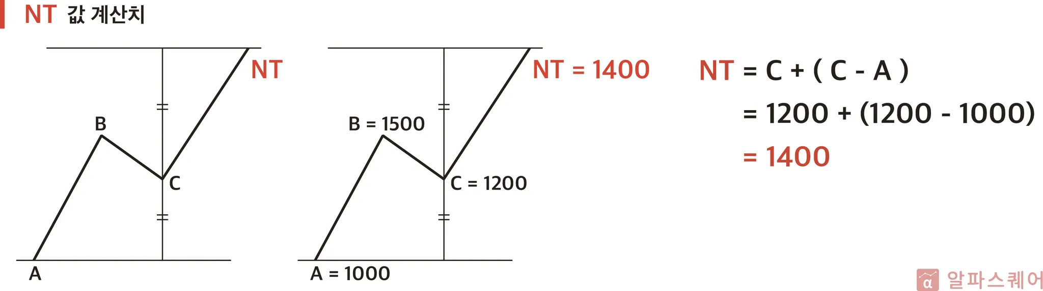 N계산치 : 상승한 가격(B-A)만큼 1차 저점(C)에서 상승한 가격. 가격의 상승으로 얻은 이익만큼의 가격을 손실한 시점에서 얻을 수 있는 목표치를 추정할 때 사용된다.