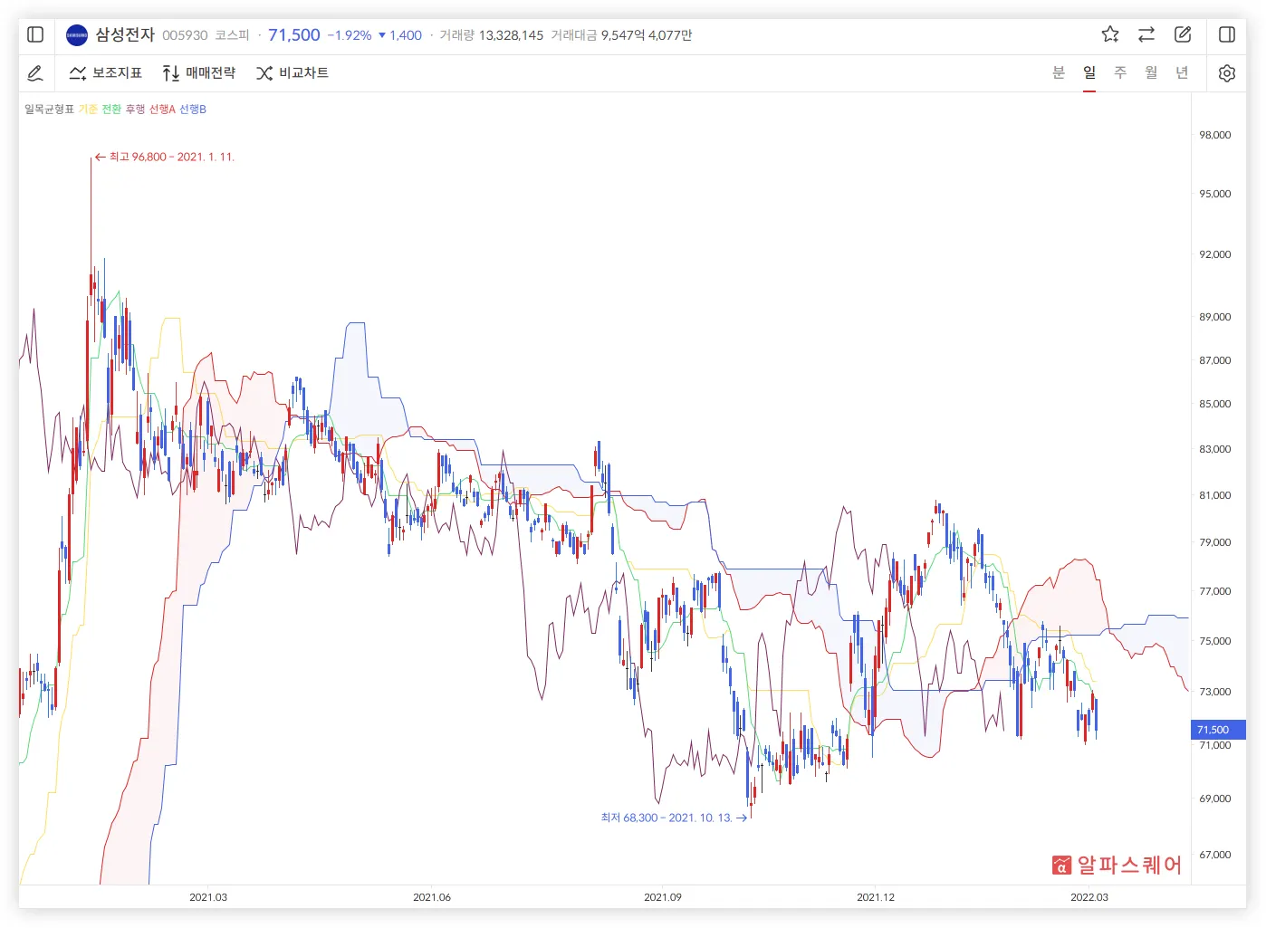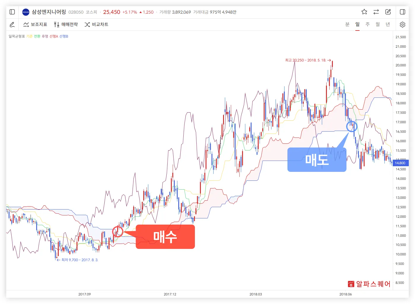 기준선과 전환선의 교차를 이용한 매매전략은 이동평균선에서의 골든크로스, 데드크로스의 개념과 비슷하다.