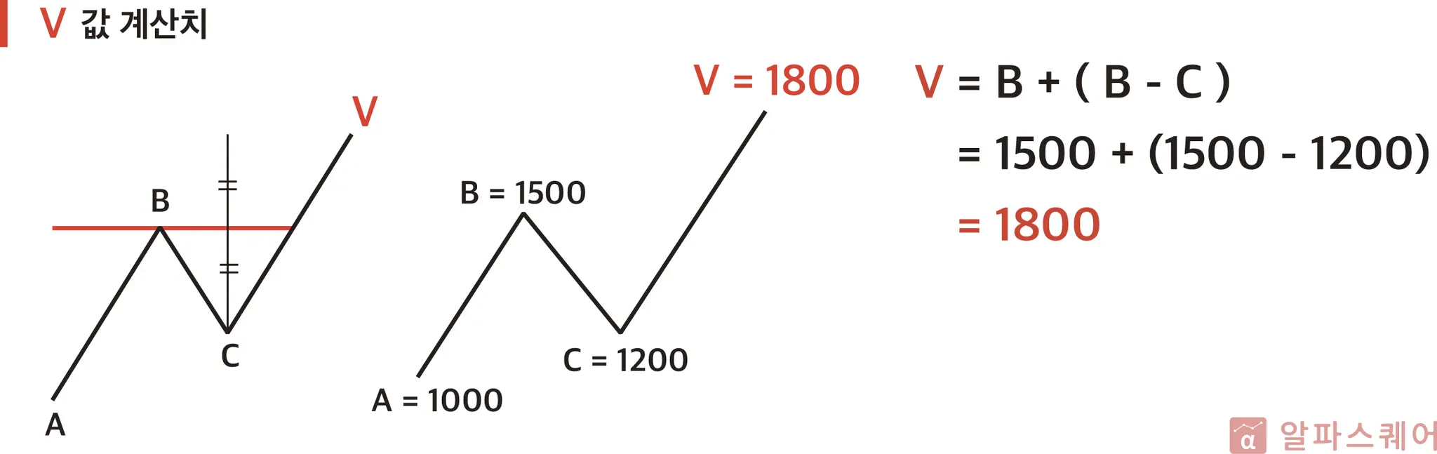 V계산치 : 1차 고점(B)에서 가격의 하락폭(B-C)의 배수를 되돌리는 가격. 가격의 하락으로 생긴 손실을 회복하고 손실된 가격만큼의 이익을 얻을 수 있는 목표치를 추정할 때 사용된다.