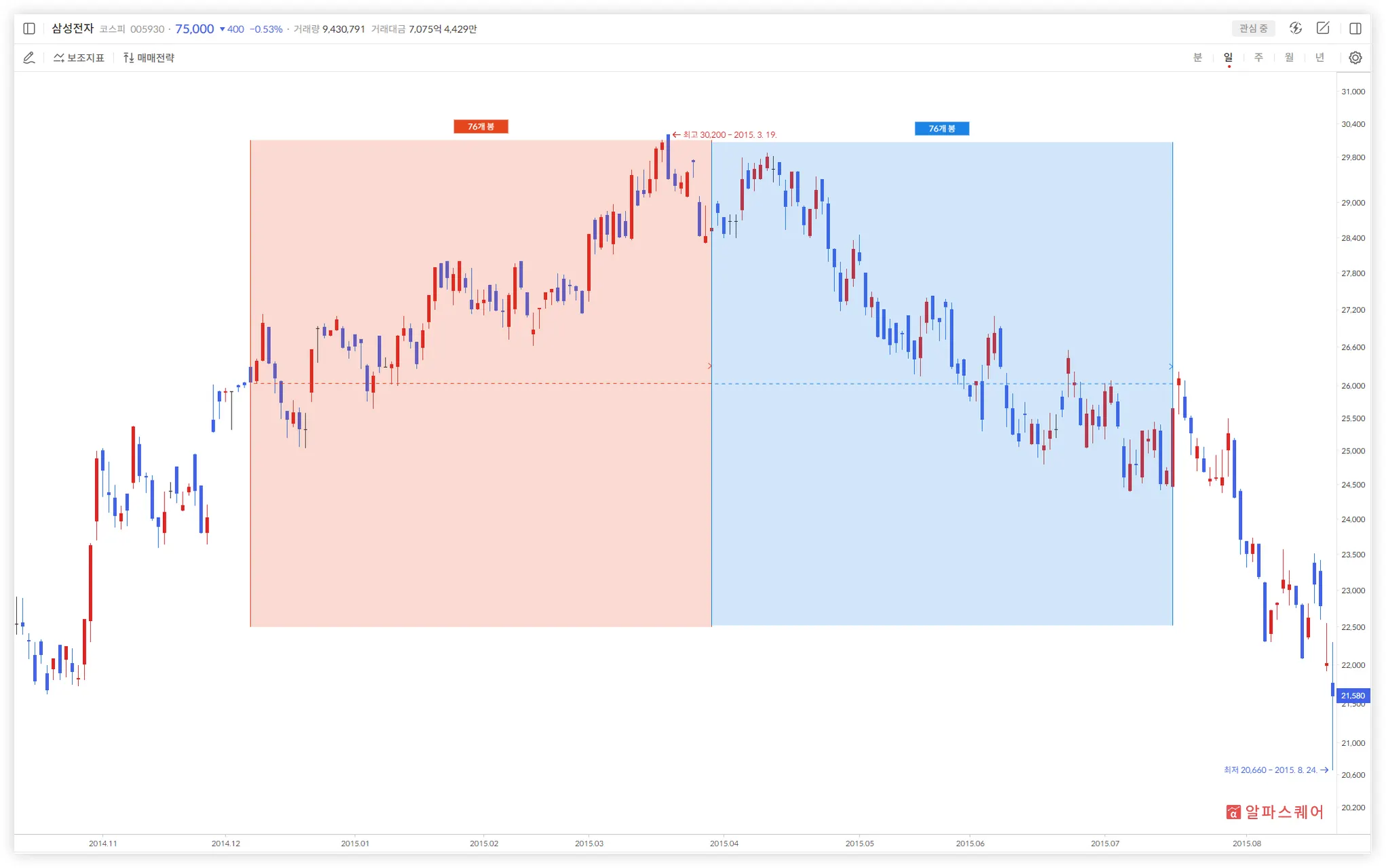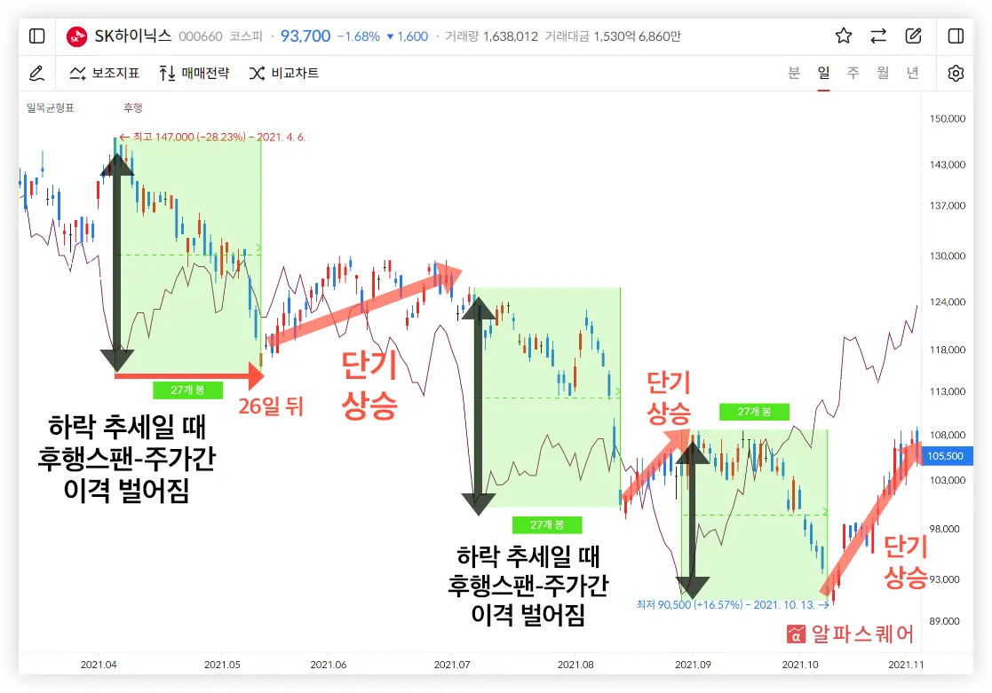 다만, 주가와 후행스팬 사이의 이격이 최대로 벌어졌는지를 거래 시점에서 알 수는 없다. 따라서 거리가 가장 멀어지고 가까워졌다는 자신만의 기준을 세워 판단하는 것이 좋다.