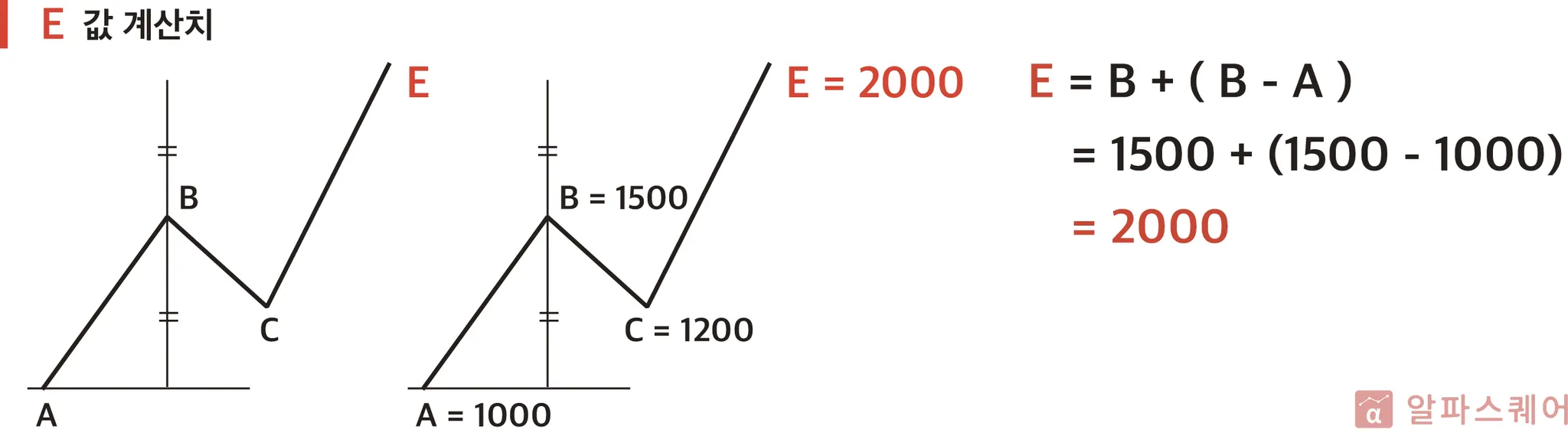 E계산치: 상승한 가격(B-A)을 1차 고점(B)에 가산한 가격. E계산값은 새로운 N파동이 형성될 시 거래 목표값으로 사용할 수 있다.