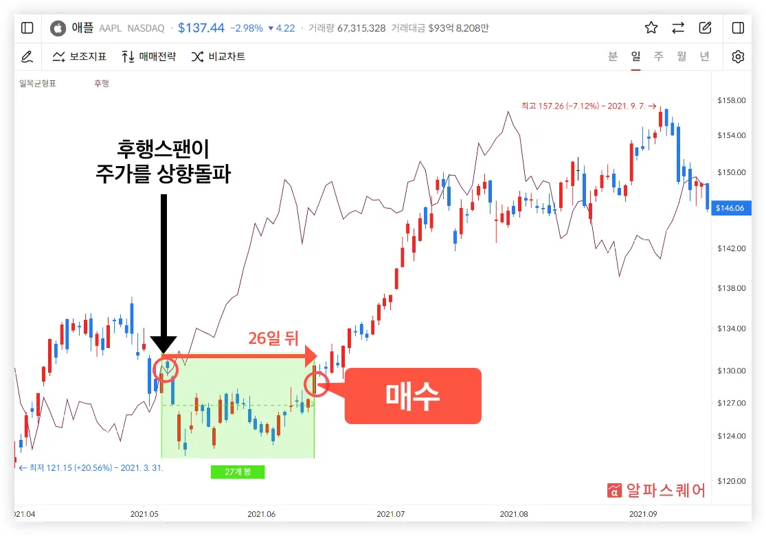 후행스팬과 과거 주가의 교차와 이격을 매매에 활용할 수 있다.