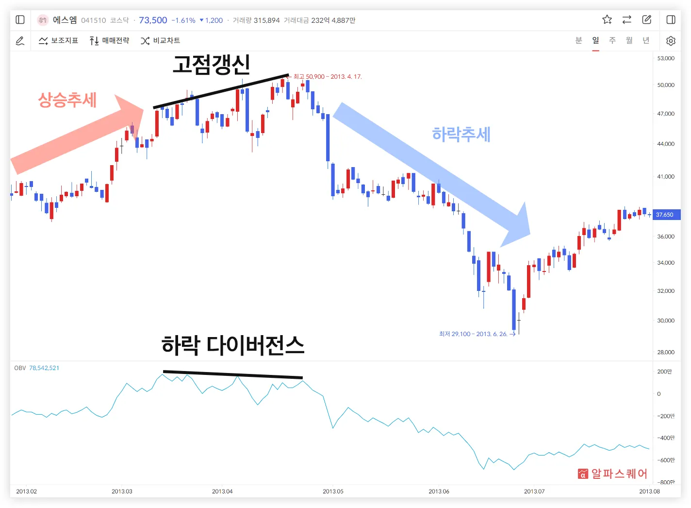 하락 다이버전스는 OBV가 고점을 낮춰가는 동안 주가는 계속해서 상승하는 경우를 나타내며, 진행중이던 상승 추세가 마무리되고 곧 하락 추세로 반전될 것임을 암시한다.