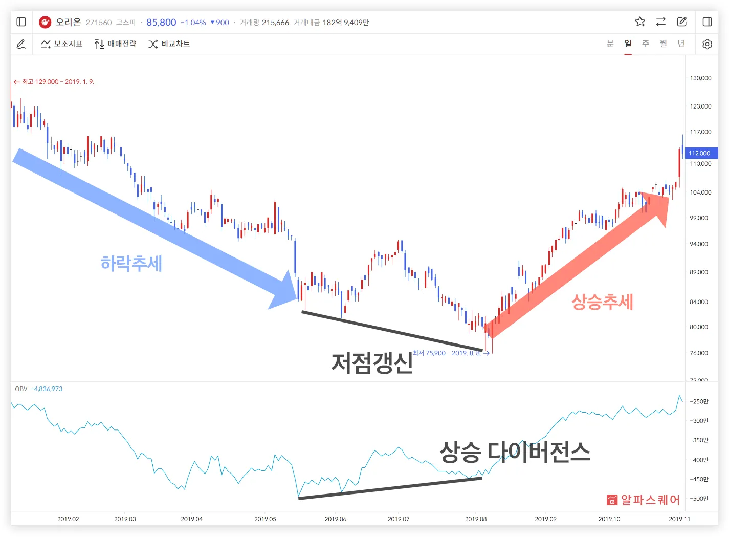 OBV와 주가가 함께 움직일 때 현재 추세가 어떤 방향인지 확인할 수 있다.