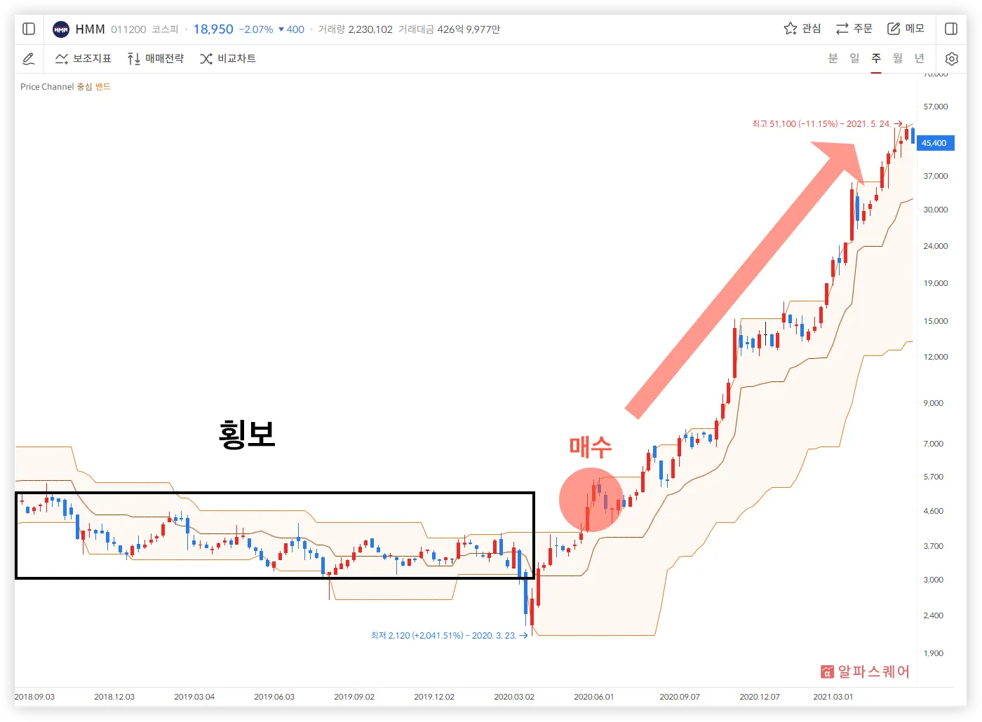 주가가 Price Channel의 상하단 밴드 사이에 횡보하며 머물다가 상단 밴드를 돌파해 상승하는 것은 상승 추세의 시작으로 해석될 수 있다. 이 때, 주가의 상승을 예상하고 매수하는 전략이 사용가능하다. 하지만 모든 상향 돌파가 매수 신호는 아니기 때문에 거짓 신호를 찾아내야 한다.