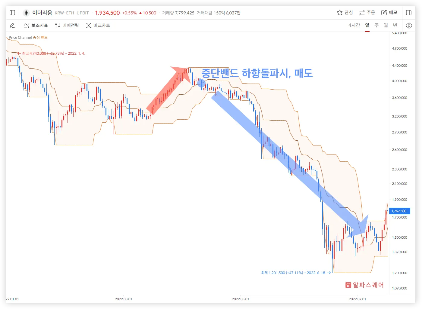 Price Channel의 상/하단 밴드는 최근 주가의 최고가와 최저가로 결정된다. 그러므로 주가가 상단 밴드에 닿는 것은 최근 고가를 넘어서 상승하는 것을, 하단 밴드에 닿는 것은 최근 저가를 넘어서 하락하는 것을 의미한다.