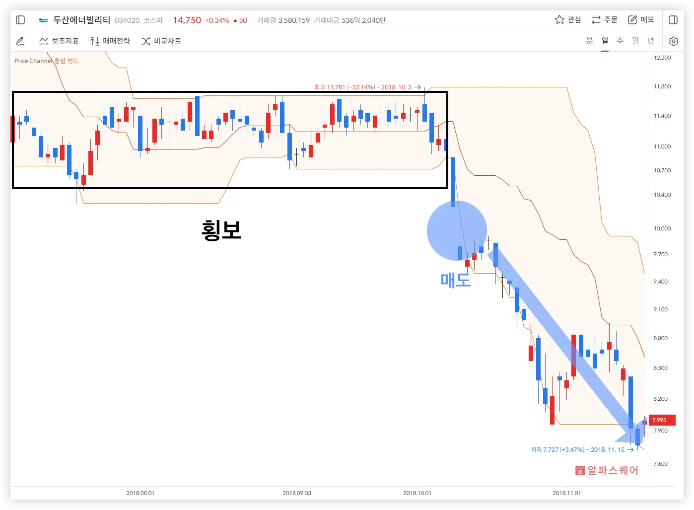이런 약한 상승세에서 주가가 하락해 중단 밴드를 하향 돌파한다면 하락 전환의 신호로 해석할 수 있다. 이 때, 상승 추세를 추종해 매수 포지션을 유지 중이었다면 주가의 하락을 기대하며 매도하는 전략을 사용할 수 있다.