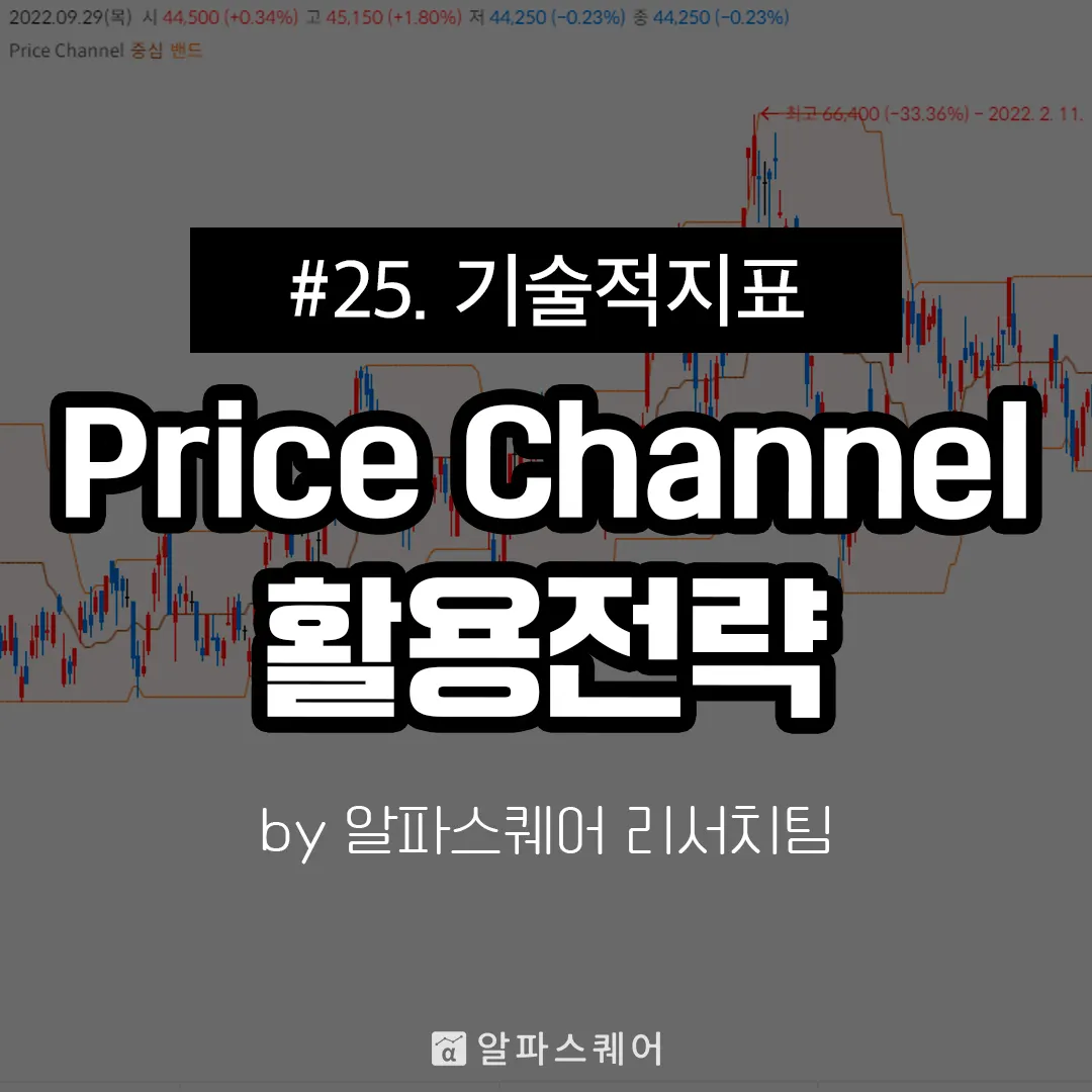 Price Channel은 시장의 변동성을 측정하고 과매수/과매도 시기로부터의 탈출을 알아내기 위해 만들어진 차트 지표다. 최근 일정 기간 내의 최고가와 최저가로 상하단 밴드를 구성하며 중단밴드는 상하단 밴드의 평균으로 이루어진다. 일반적으로 주가가 상단 밴드를 상향 돌파하면 과매수 상태로 해석하고 하단 밴드를 하향 돌파하면 과매도 상태로 해석한다.