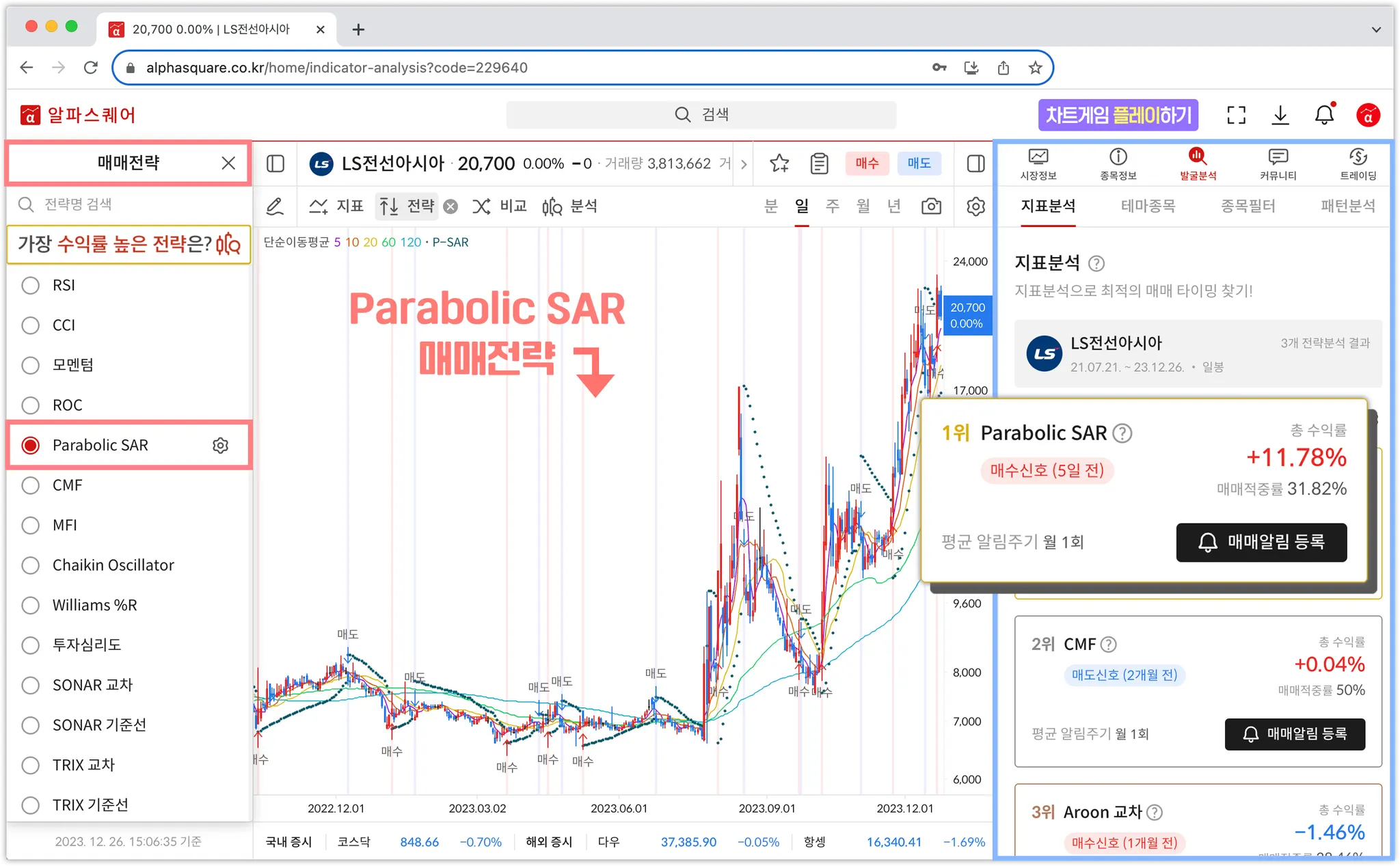 ’지표분석’에서 PSAR 매매전략 수익률 확인하기