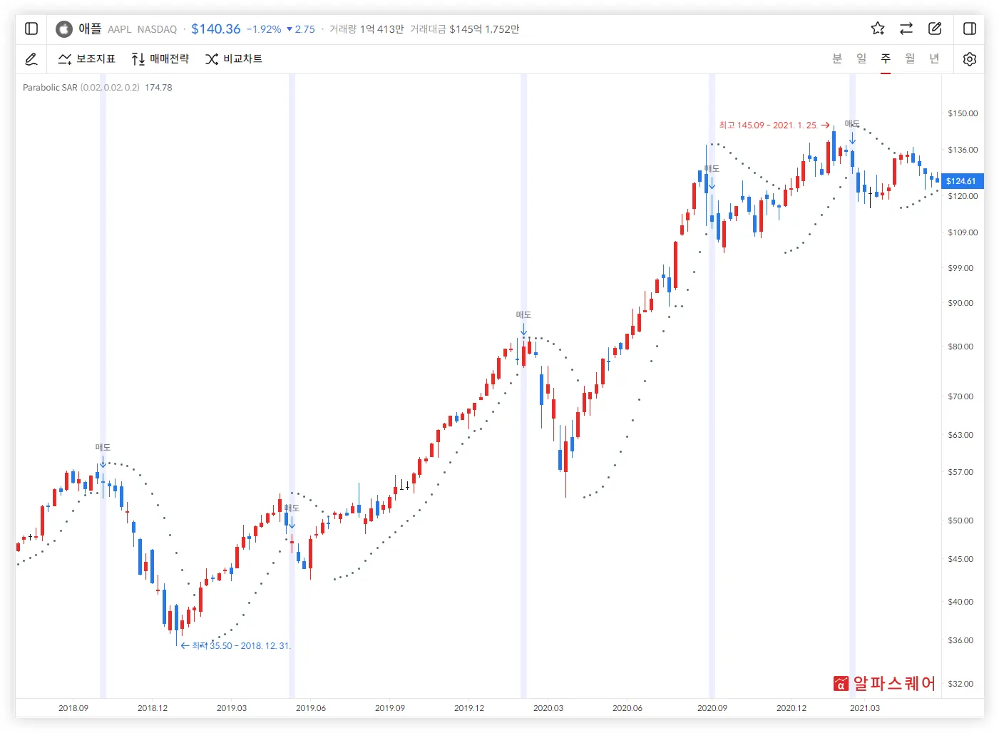 PSAR은 추세가 약한 장세에서 손실을 볼 가능성이 커지기 때문에, 다른 지표들과 함께 사용하는 것이 좋다.