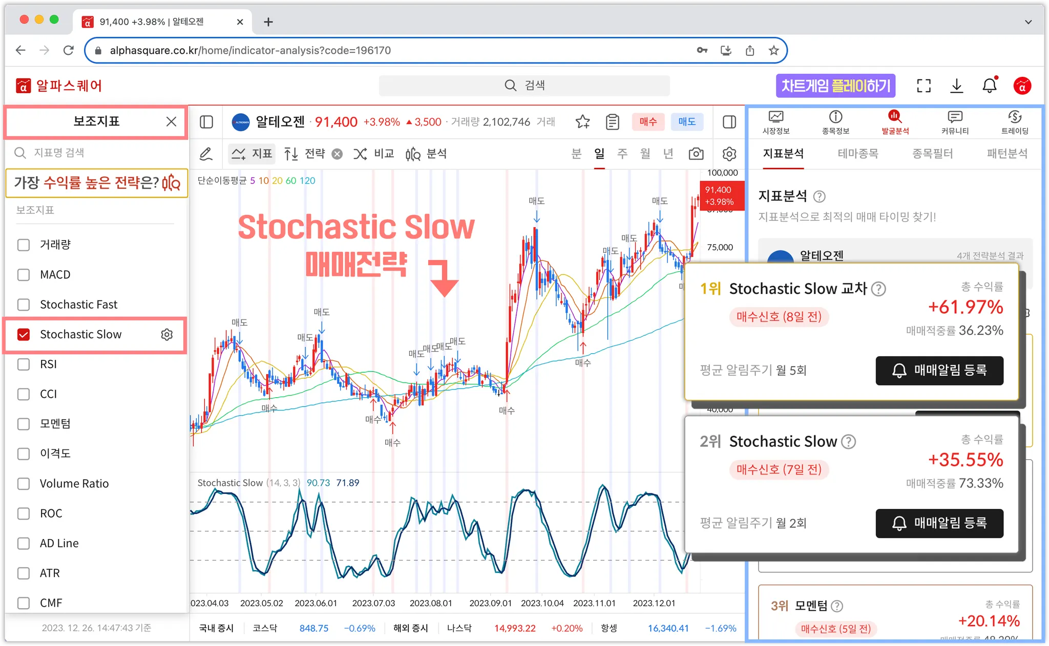 ’지표분석’에서 스토캐스틱 슬로우 매매전략 수익률 확인하기