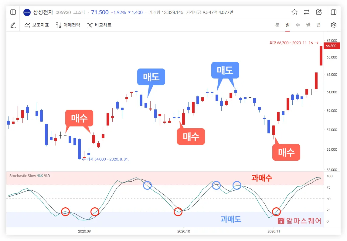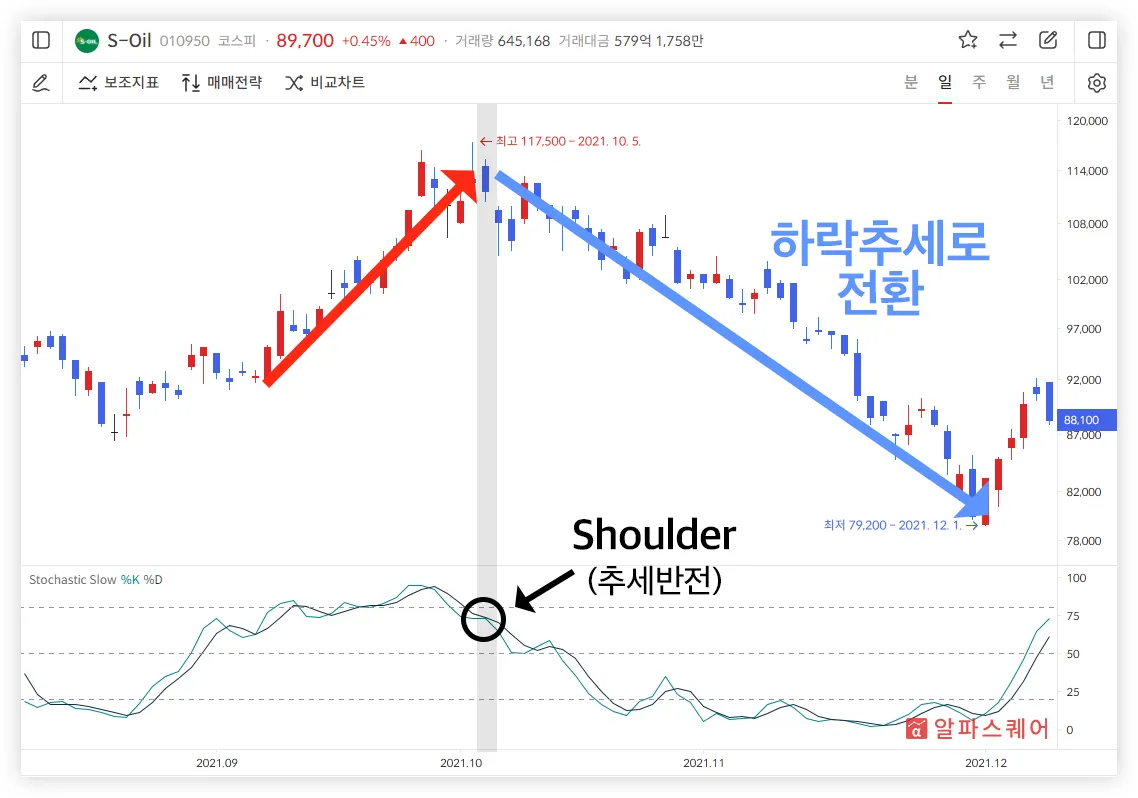 Stochastic-slow Shoulder 예시(차트: 알파스퀘어)