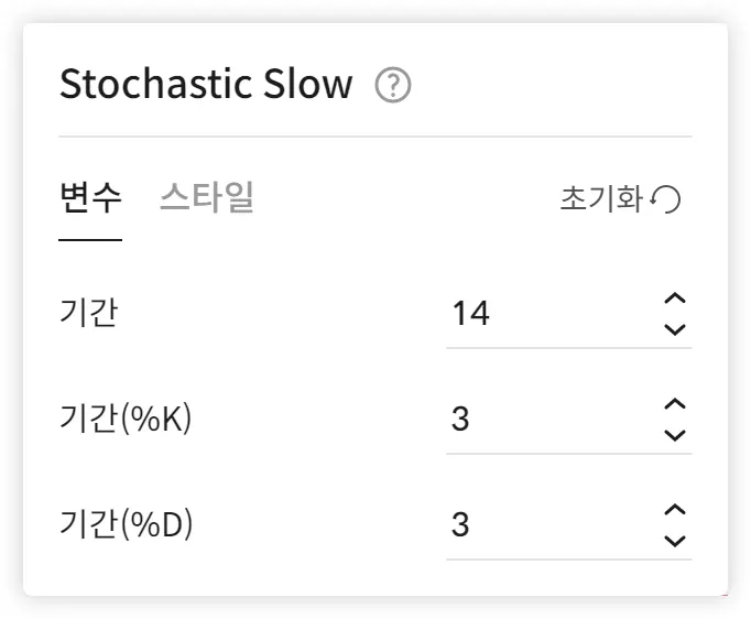 기간(%K) =스토캐스틱 패스트의 이동평균을 구할 기간을 설정하며 M에 대응하는 값이다. 기본값은 3일이며, 이 값은 스토캐스틱 패스트의 %D와 동일하다.