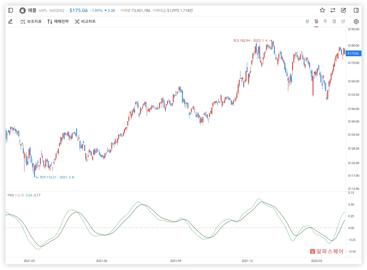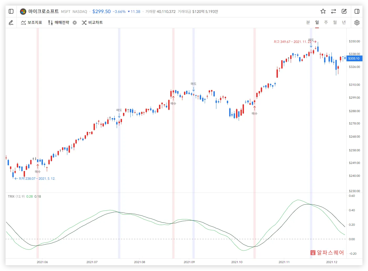 TRIX가 시그널선을 상향 돌파하면 매수, 하향 돌파하면 매도 시점으로 활용한다.