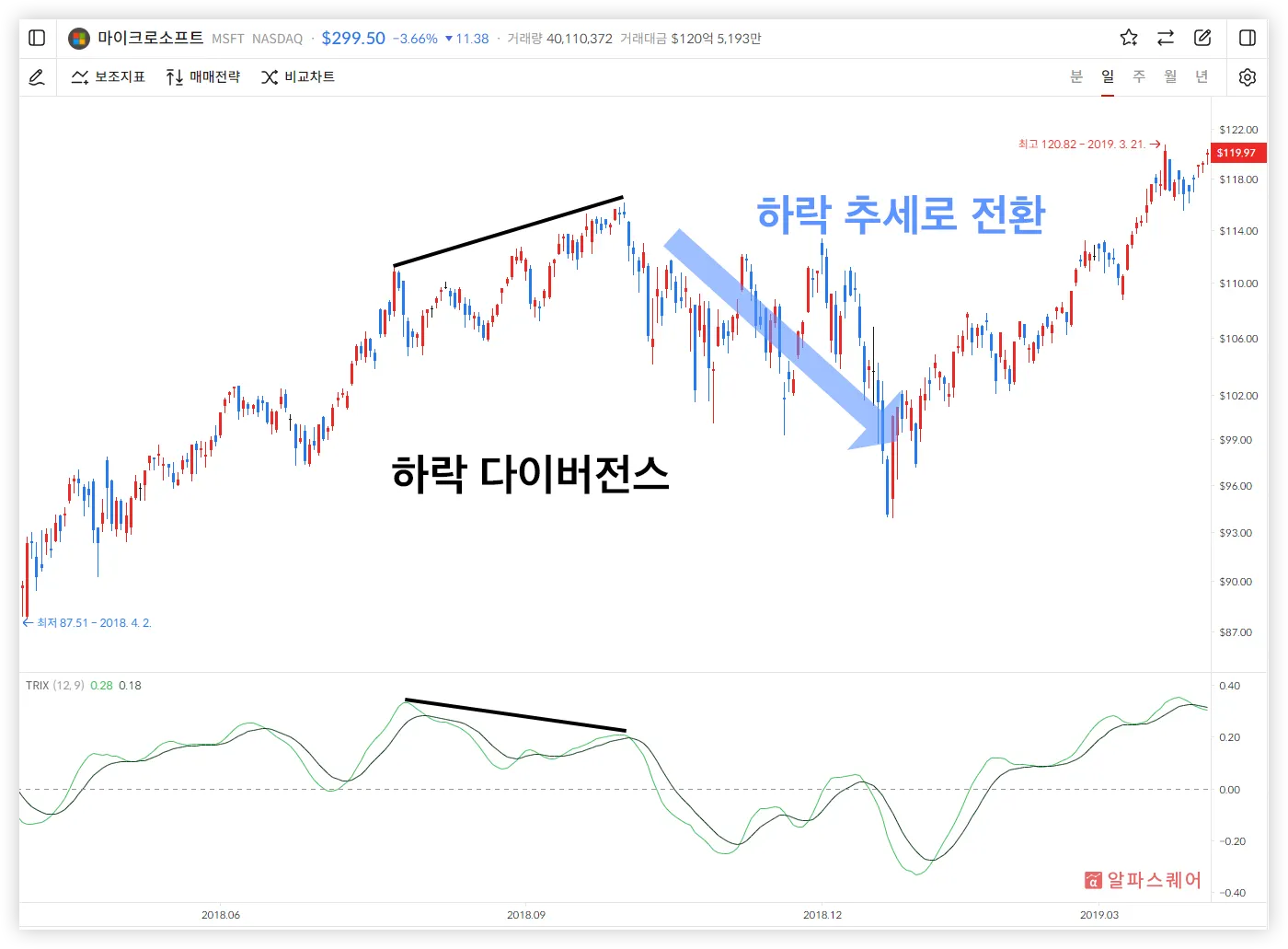 반대로 주가는 고점을 높이며 상승하지만 TRIX는 고점이 점점 낮아지며 하락하는 경우, 약세 다이버전스가 발생한 것으로 파악할 수 있다. 이는 상승 추세가 곧 마무리되고 하락 추세로 전환될 것임을 암시한다.