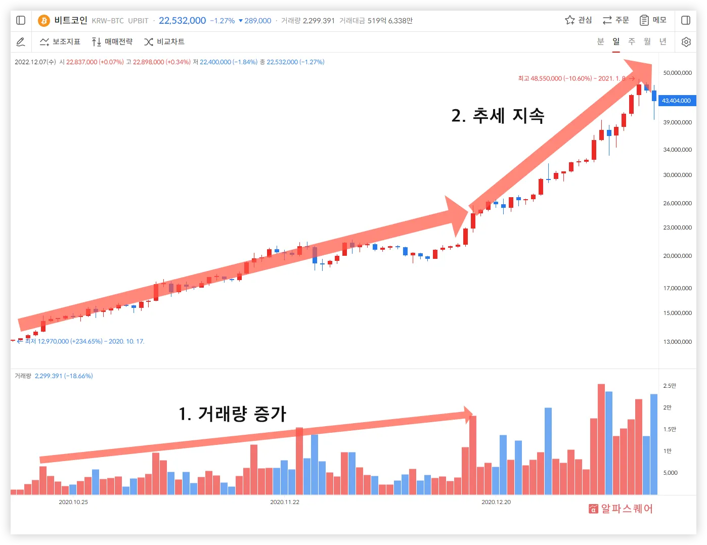 주가의 추세와 함께 거래량을 살펴보면, 추세가 향후 어떻게 진행될지를 예상하는데 도움이 될 수 있다. 만약 주가의 추세가 상승중일 때, 거래량 또한 전반적으로 상승하고 있다면 해당 주식의 가격이 비싸지고 있음에도 더 많은 사람이 사고 싶어 한다는 것을 의미한다. 따라서 매수심리가 상승 추세를 뒷받침해주기 때문에, 상승 추세가 지속될 것이라고 예상하여 매수를 고려해볼 수 있다.